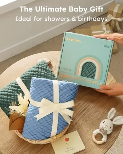 [Soft and Absorbent] - 100% high quality muslin organic cotton, the best fabric for babies, makes the baby bath towel super soft than regular cotton towel. It absorbs the water off baby quickly and keeps baby warm after baths. [Excellent Durability] - The 6 layers thickness muslin design is long-lasting enough for everyday use. Sized in 32 x 32 inches, the hooded baby towels are suitable for newborns, infants, toddlers, and small kids up to 3 years old. [Easy Care] - Our muslin baby towels with hood will keep its softness, thickness and color even after many washes, machine washable and quick dry. The set of 2 baby towels for newborn is more convenient for daily change and easy clean up. [Versatile Usage] - Not only used as baby bath towel, it can also be used as baby blanket, swaddling, changing mat cover. Wrap your little one in this soft baby hooded towel after bathing him in a tub, at the pool or beach. [Perfect Baby Gift] - As a lovely and practical baby essential, our hooded baby towels for boys and girls is a perfect unisex baby shower gift, or baby registry gift!