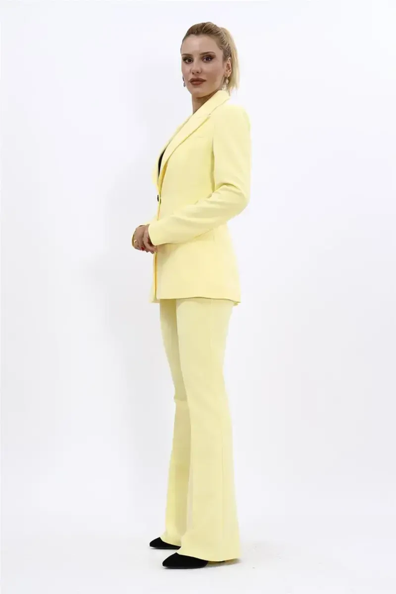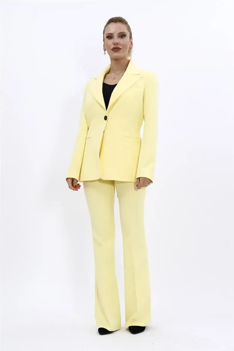 Şıklığı ve rahatlığı bir arada sunan Yakalı Klasik Ceket & İspanyol Paça Pantolon Takımımız ile tanışın! Sarı rengiyle enerjinizi yansıtan bu özel tasarım takım, hem günlük kullanımınızda hem de özel günlerinizde size eşlik edecek. ÖNDER ÖZSOY tarafından üretilen bu takım, yüksek kaliteli malzemesi ve modern kesimiyle gardırobunuzun vazgeçilmezi olacak. Takımımız, klasik bir ceket ve trend İspanyol paça pantolondan oluşmaktadır. Ceket, şık yakası ve ön kısmında bulunan tek düğmesi ile dikkat çekerken, pantolon beli lastikli ve yandan fermuarlı yapısıyla konforlu bir kullanım sunar. Bu takım, stil sahibi kadınların beğenisini kazanacak ve onlara benzersiz bir görünüm kazandıracaktır. Kendi üretimimiz olan bu takım, titizlikle hazırlanmış olup, kalite standartlarına uygun olarak üretilmiştir. Stüdyo çekimlerinde renkler ışık farklılığından dolayı değişiklik gösterebilir, bu nedenle ürünün gerçek rengi ile ekranınızdaki renk arasında küçük farklılıklar olabilir. Siz de bu şık ve rahat takıma sahip olarak, tarzınızı en iyi şekilde yansıtabilirsiniz. Unutmayın, bu özel tasarım takım, kampanya fiyatıyla sınırlı sayıda sunulmaktadır.