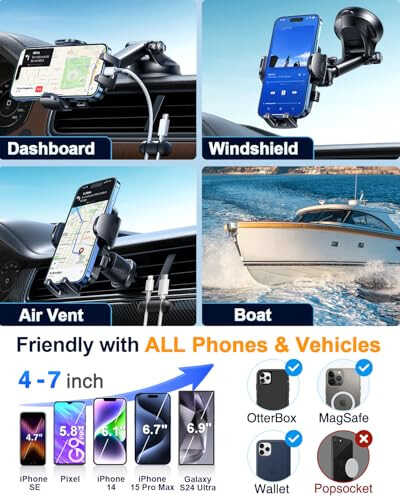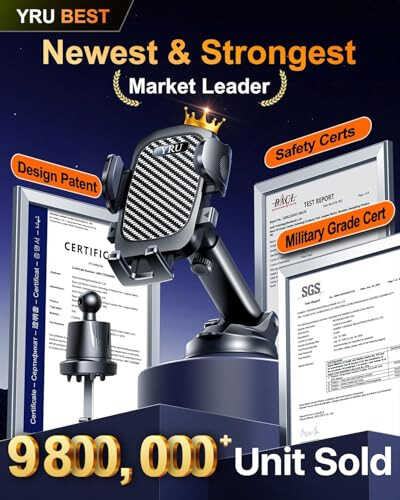 【𝐀𝐫𝐞 𝐘𝐨𝐮 𝐒𝐞𝐚𝐫𝐜𝐡𝐢𝐧𝐠 𝐟𝐨𝐫 𝐆𝐢𝐟𝐭𝐬? 𝐒𝐚𝐟𝐞𝐭𝐲 𝐢𝐬 𝐭𝐡𝐞 𝐁𝐞𝐬𝐭 𝐆𝐢𝐟𝐭】Birthday, Valentine's Day, Mother's Day, Father's Day, Thanksgiving, Easter, Halloween, Christmas, etc... are all good gift choices. It is a good practical gift for parents, lovers, siblings, friends, colleagues, and employees. The exquisite cell phone holder has a Grandmaster-designed suction mount & vent clip Combo with a soft cable organizer. All are Well-packaged in a Reliable, Elegant box. 【True Military-Grade Certified, 2025 Ultimate Car Mount】Since 2010, YRU has been devoted to R&D High-end Car Mounts. Over the past 15 years, we listened to millions of users' voices, and rigorously tested to MILITARY GRADE Standards (stability, compatibility, flexibility, security, durability, ease of use). Finally, we made this BEST Version in every aspect. Certified by All Safety Agencies: Military-grade Shockproof, RoHS, CP65, REACH. 【Invincible Rotatable 90LBS Black Sucker, 2025 Strongest - No Melt, No Yellow】Our Upgraded Larger Rotatable Black Sucker with 1-Press Lock is the Most Powerful (Diameter of PU Adhesive: 2.5”→2.9”, Suction Force: 60LBS→90+LBS) & Most Resistant (-40℉~203℉) to fit Bad Road, Heavy Phone & Extreme Weather. Easily Removed with Tear-notch & can be Washed Clean and Reused. PS. The dash pad working with the clear sucker often ruined the dashboards, but our upgraded sticky sucker doesn’t Need it. 【Patened 2-Button Design Brings Best User Experience】Unlike short 1-release-button blocked by phone & hard to bend fingers to access, this 2-Side Larger Release-Buttons are the easiest & most comfortable to touch. Each button can work alone, so Friendly with Any Hand/Finger. Thanks to millions of users for the feedback and love! 【Multi-Functional Phone Bracket for 99% Car, Truck, Pickup, Jeep, SUV, Boat, Desk, Kitchen, Bathroom, Gym, Dashboard, Windshield, Vent】Are you not sure which installation would best suit your vehicle? No problem the unit is extremely flexible!!! Any small flat & smooth area can be stuck or any vent blade can be clipped, all places work perfectly! 【2025 Design: Hook-and-Swivel Clamp Fits 99% of Vent Blades】 This innovative rotating hook clamp securely clamps to vent blades of any thickness (vertical or horizontal) with the twist of a knob. Its sturdy steel construction ensures it never comes loose. Its rigid, pure steel clip securely fastens to the vent, preventing it from falling and providing shockproof protection. The extended design reduces airflow obstruction and protects your phone. 【High-end = Quality Materials + Grandmaster Design】YRU car phone mount made of Premium PC+ABS material, which is selected from 4,000 kinds of materials, passed Industry-Leading Safety Tests (Monthly 5,000+ open/close test; 10,000+ vibration resistance; 100,000+km rugged road tests; -40~203℉ laboratory test...). Based on the lever principle, an EXTRA Rubber Support is added as a Stabilizer at the end of the telescope arm to avoid Shake and fall. 【Caring Cable Manager = 1s Charger Phone = Convenient & Safe Driving]】Listen to the voice of customers, we add a 2-cable organizer made of premium soft Silicone Rubber, which can hold all types of cords of Phone/GPS/Camera/Earphone, to keep your car Tidy so enjoy Happy & Safe Driving. 【Warm Tips】1. Clean the Surface with included wipes Before Install! 2. Leather【except faux and synthetic leather】/waxed/oiled dashboards are NOT suitable for ALL suction cups. Please use the mount on the windshield or air vent instead. 3. When the outside temp>113°F, it's better to use an Air Vent instead of a Sucker. 4. For maximum adhesion, make sure the suction cups are installed in a temperature range of 68°F to 77°F (10°C to 25°C) and left for 1 hour before use Depth of Phone Cradle: 0.8" (Thick Case Friendly); Width of Clamp Arm: 2.4"-4.6" (Universal Phone Friendly); Diameter of Suction base: 2.9" (Install on Clean&Smooth Spot without any dust/dirt/gap/crack); Length of Telescopic Arm: 5.5"-9.2"; Height of Suction Base: 1.9"