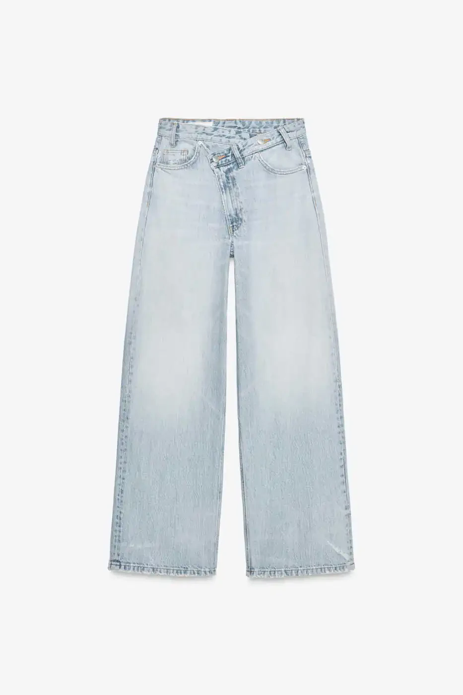 Yüksek bel jean, çapraz kesim jean, geniş paça jean, açık mavi jean, TRF jean, kadın jean, pamuklu jean, trend jean, modern jean, rahat jean