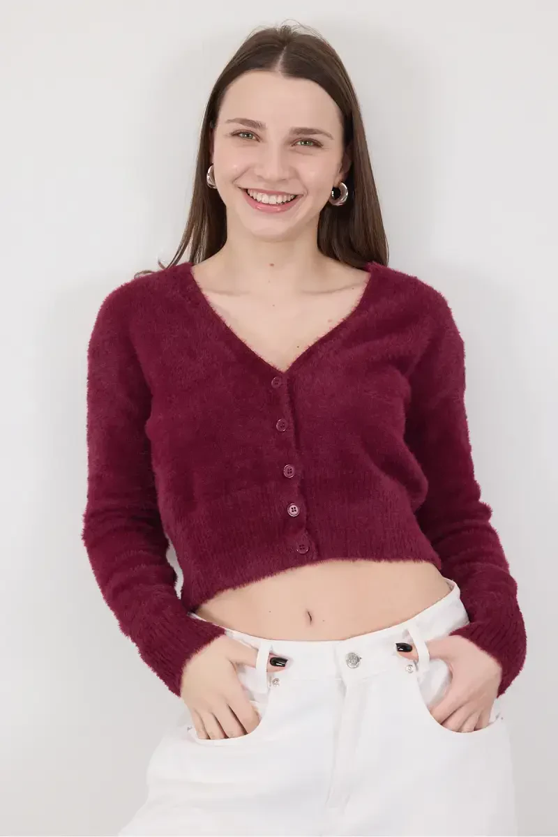 Crop hırka, düğmeli hırka, bordo hırka, yumuşak hırka, kadın hırka, triko hırka, şık hırka, crop, düğme detaylı, rahat hırka