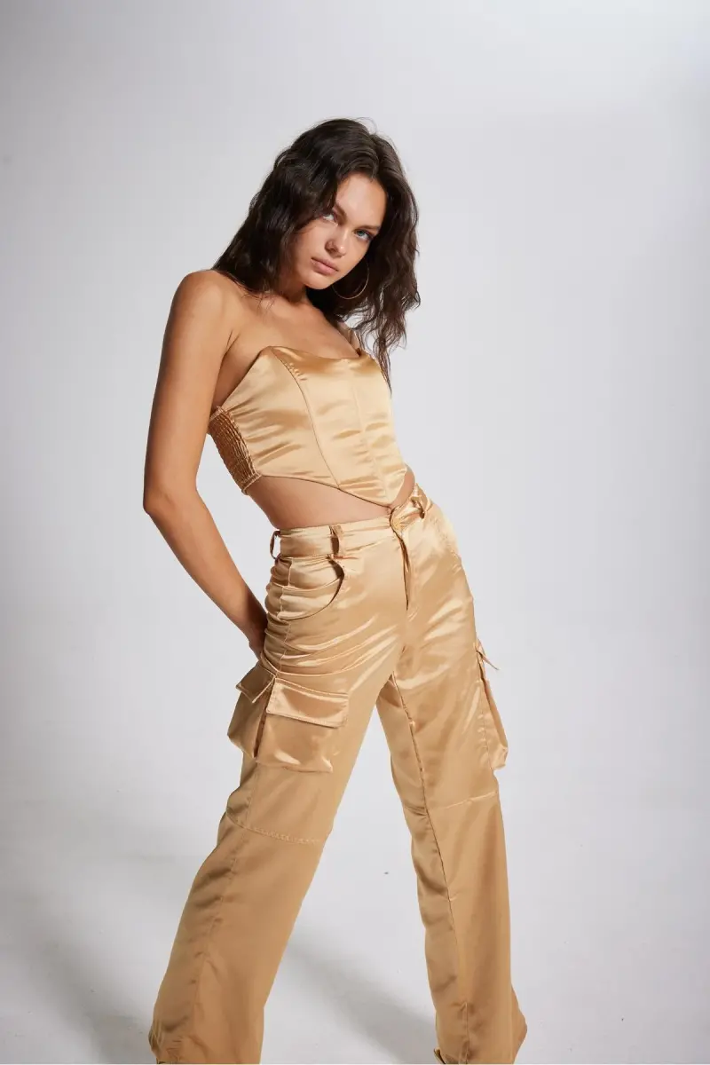 Yuqori bel yuk cho'ntakli atlas Maddy shim Bej, atlas mato, yuqori bel, yuk cho'ntakli, qulay bichim.