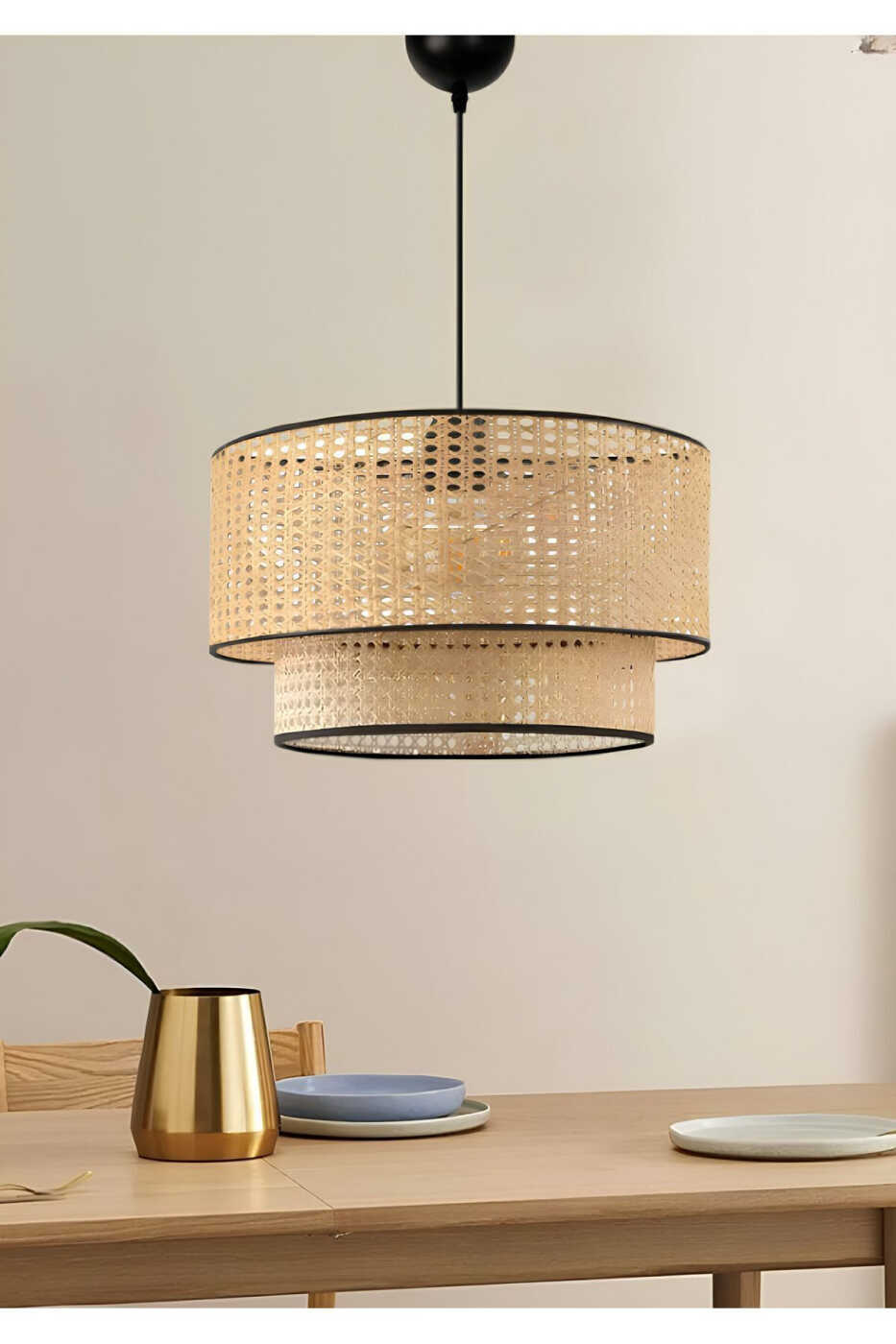 Tabiiy bambuk materiallari chandelierga iliq va mehmondo'st atmosfera bag'ishlaydi, ikki qavatli dizayni esa yorug'likning kengroq maydonga tarqalishini ta'minlaydi.