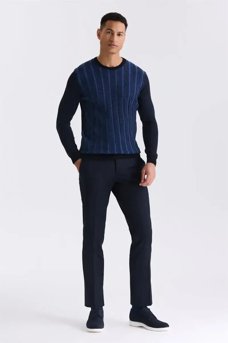 Slim fit triko kazak, chiziqli triko, moviy kazak, bisikl yaka triko, qulay triko