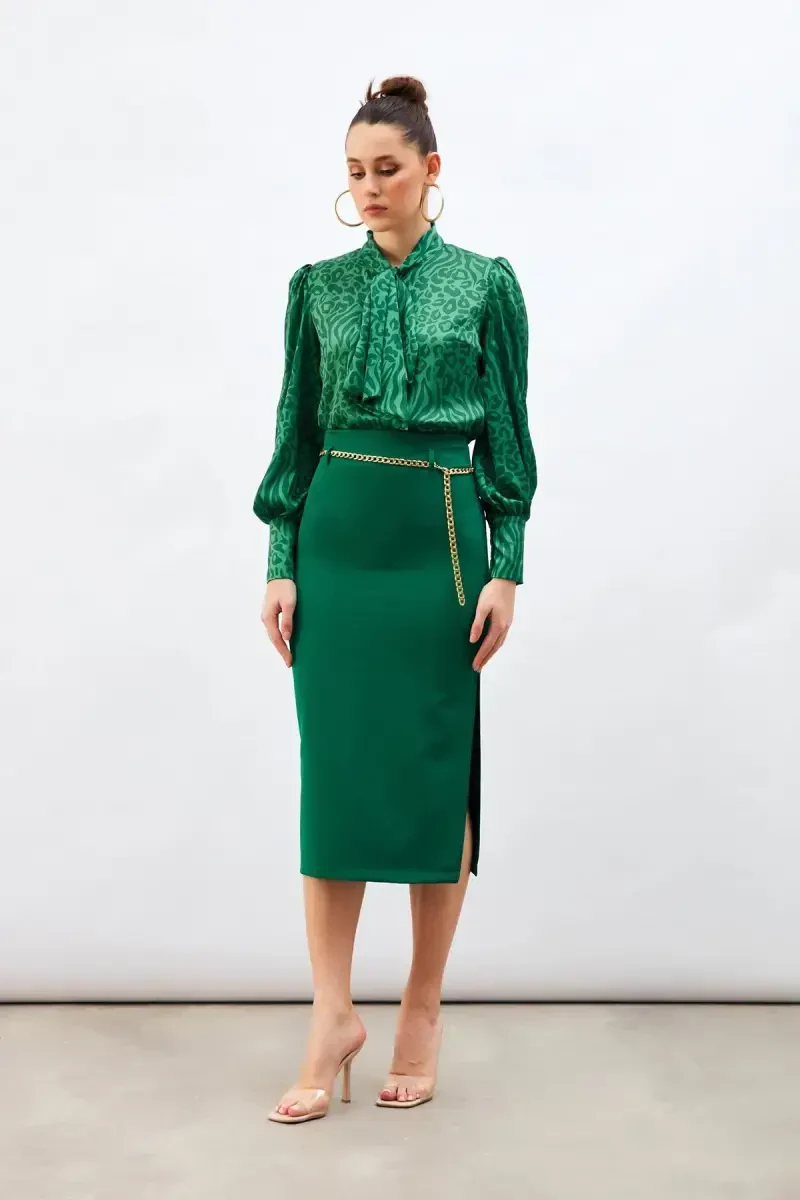 Zumrad Yashil Zanjirli Kamarli Qalam Yubka sizga zamonaviy va nafis ko'rinish baxsh etadi. Shkafingizni boyitish uchun bu noyob mahsulotni darhol buyurtma bering!