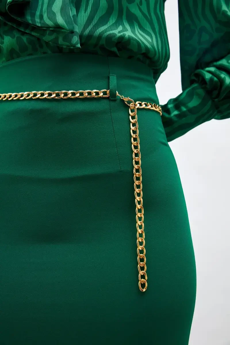 Yaltiraydigan zanjirli kamar bilan yubkangizning nafisligini oshiring. Zumrad yashil rangi har bir teri rangiga mos keladi, sizni yanada jozibali qiladi. Ofis nafisligidan kechki tadbirlarga qadar har qanday muhitda bepul foydalanishingiz mumkin bo'lgan bu yubka kombinlaringizni to'ldirish uchun ajoyib tanlovdir.
