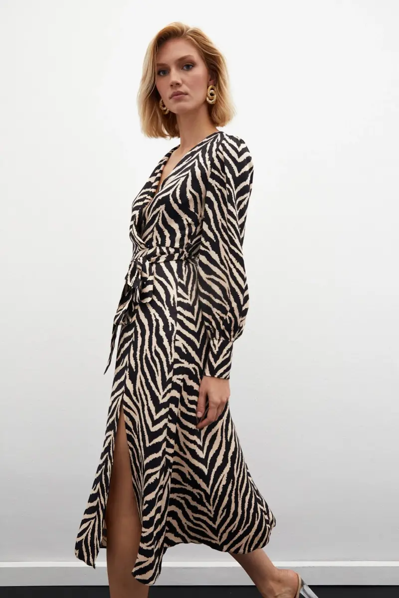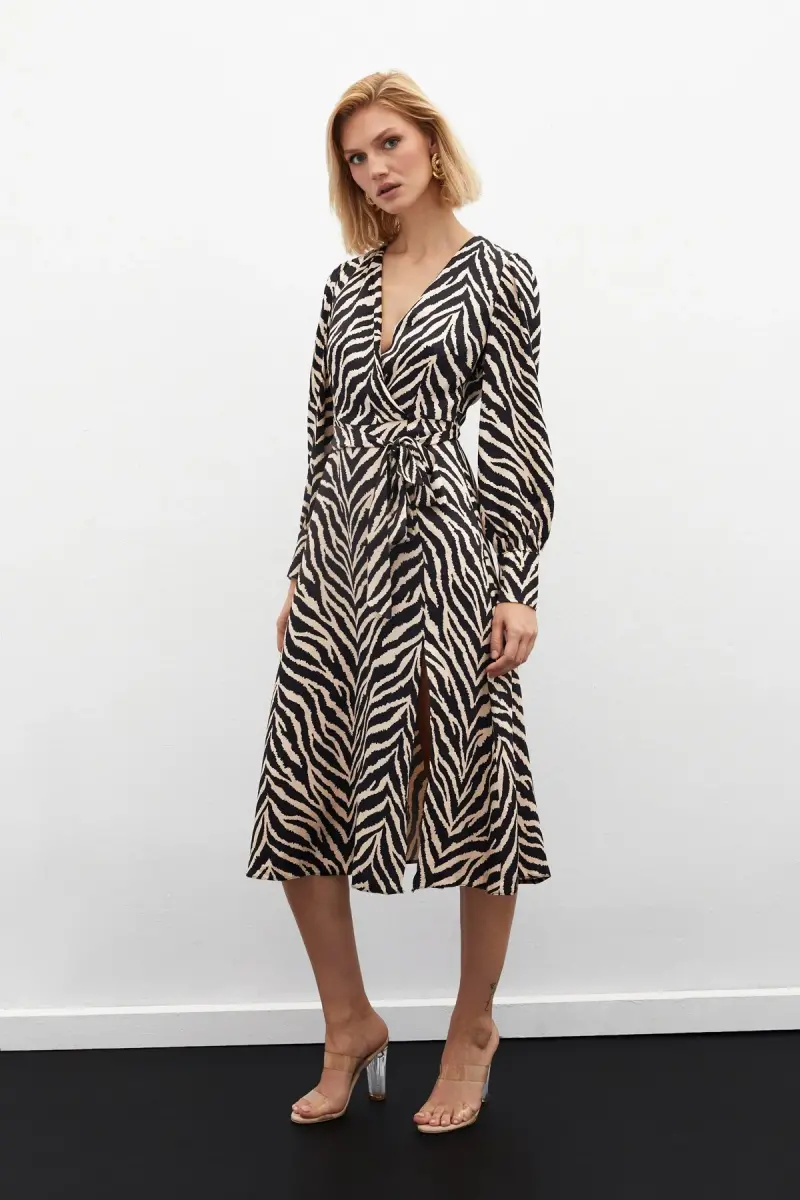 Zebra Naqshli Kamarli Atlas Ko'ylak, qora rangi bilan har qanday rang bilan uyg'unlashib, sizga kombinatsiyalarni yaratishni osonlashtiradi. Uni yuqori poshnali poyabzalingiz va zamonaviy sumkangiz bilan to'ldirganingizda, diqqatga sazovor kechki ko'ylak sifatida foydalanishingiz mumkin. Kunlik foydalanish uchun esa tekis poyabzal va sport sumkasi bilan kombinatsiyalashingiz mumkin.