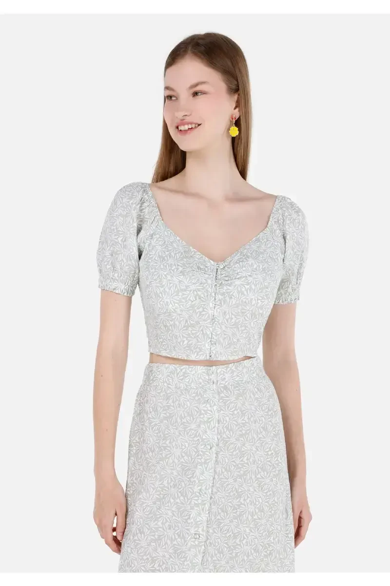 Сочетайте стиль и комфорт с помощью женской рубашки с коротким рукавом зеленого цвета с V-образным вырезом Slim Fit с принтом. Закажите сейчас и дополните свой стиль!