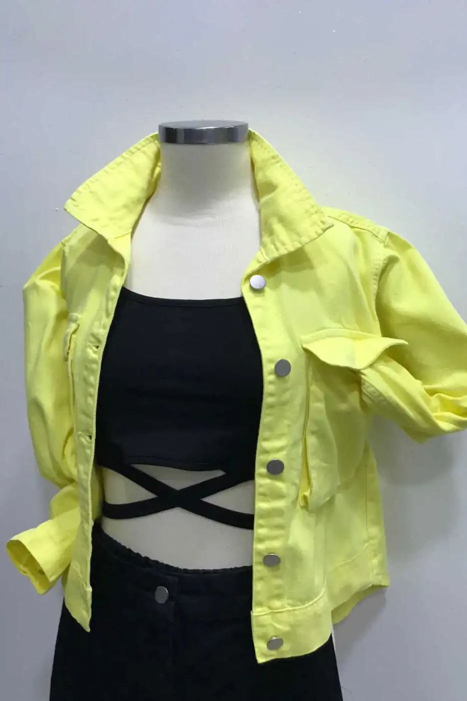Идеальная деталь, которая дополнит стиль вашей маленькой принцессы! Детская желтая джинсовая куртка с накладными карманами сочетает в себе стиль и комфорт, что делает ее идеальным дополнением к любому наряду.
