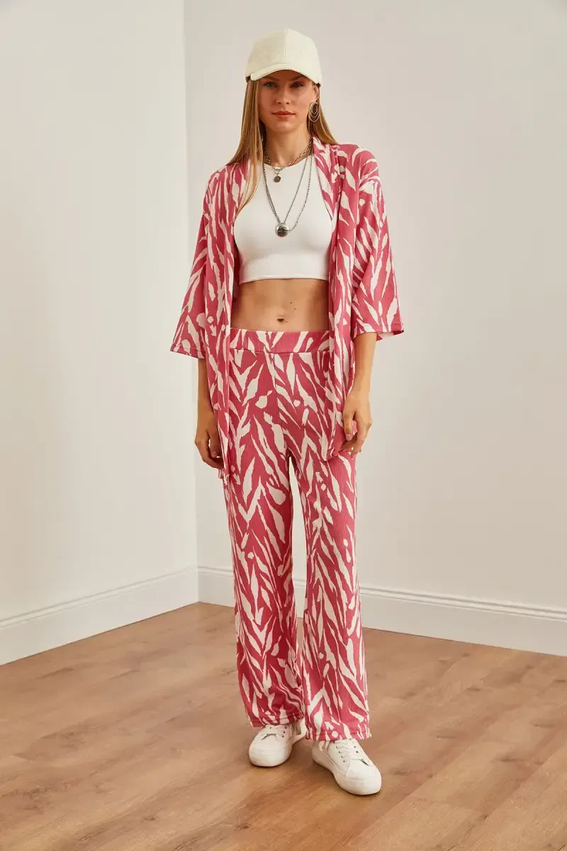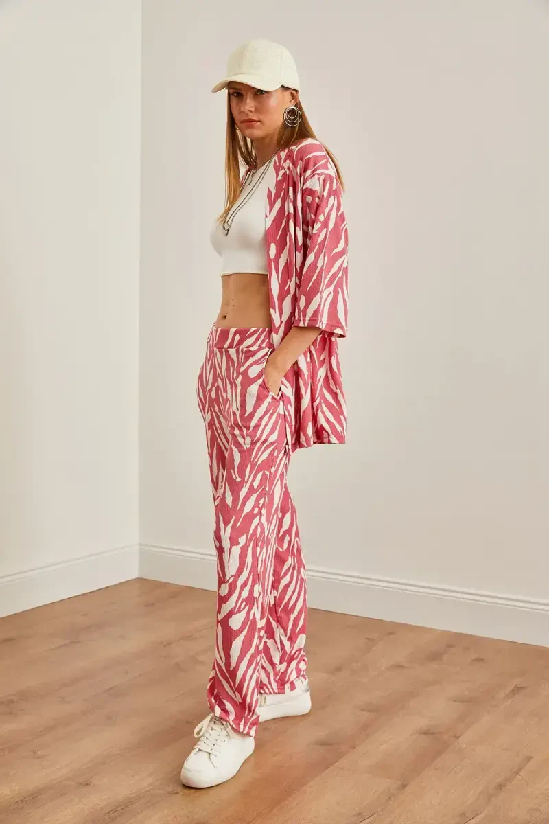 Женский комплект, состоящий из топа-кимоно нежно-розового цвета и брюк с карманами, сочетает в себе элегантность и комфорт, представляя собой оригинальный дизайн. Этот уникальный комплект позволит вам выразить свой стиль как в повседневной жизни, так и в особых случаях. Легкая и струящаяся ткань обеспечивает комфорт в течение всего дня, что делает этот комплект одним из необходимых элементов гардероба современной женщины. Гармония между верхом-кимоно и брюками с карманами создает элегантный образ и обеспечивает свободу движений. Нежно-розовый цвет подчеркивает элегантность и женственность, легко сочетаясь с любыми другими цветами. Независимо от того, собираетесь ли вы на элегантное мероприятие с туфлями на каблуке или на повседневную прогулку в кроссовках, в этом комплекте вы всегда будете выглядеть стильно. Кроме того, наличие карманов на брюках обеспечивает практичность, позволяя легко носить с собой все необходимое в течение дня. Качество ткани и внимание к деталям пошива обеспечивают долговечность этого комплекта. Этот эксклюзивный дизайн, предлагаемый с гарантией Olalook official, станет незаменимой частью вашего гардероба. Этот комплект не только позволит вам выглядеть стильно, но и чувствовать себя хорошо. Энергия нежно-розового цвета и комфорт дизайна помогут вам позитивно провести день и подчеркнуть свой стиль. Если вы хотите чувствовать себя особенной и привлекать внимание, этот комплект идеально вам подойдет!