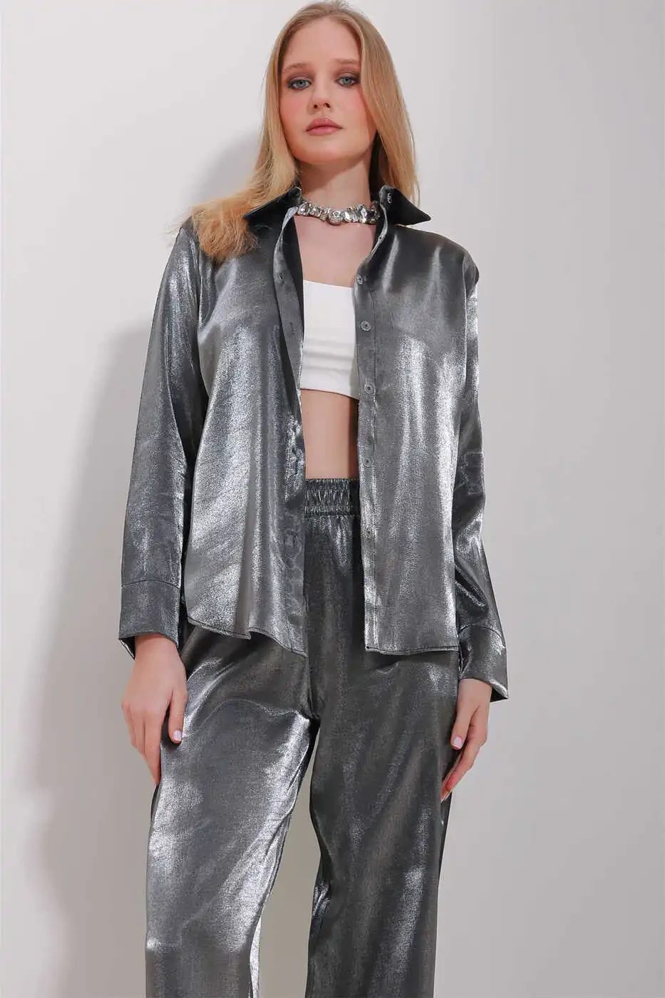 Сочетая стиль и комфорт, женская антрацитовая рубашка оверсайз с блестящей тканью станет незаменимой частью вашего гардероба. Рубашка, обеспечивающая комфорт в течение всего дня благодаря своему свободному крою, добавит шика вашему стилю своим антрацитовым цветом и блестящей текстурой.