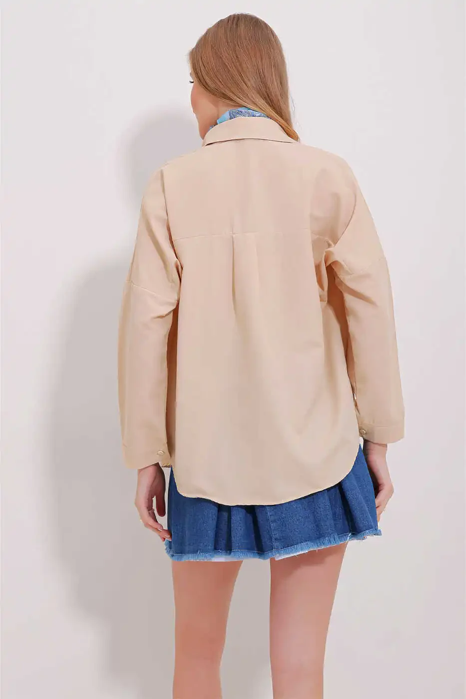 Женская рубашка, Бежевая рубашка, Рубашка с манжетами, Базовая рубашка, Хлопковая рубашка, ALC-X11494