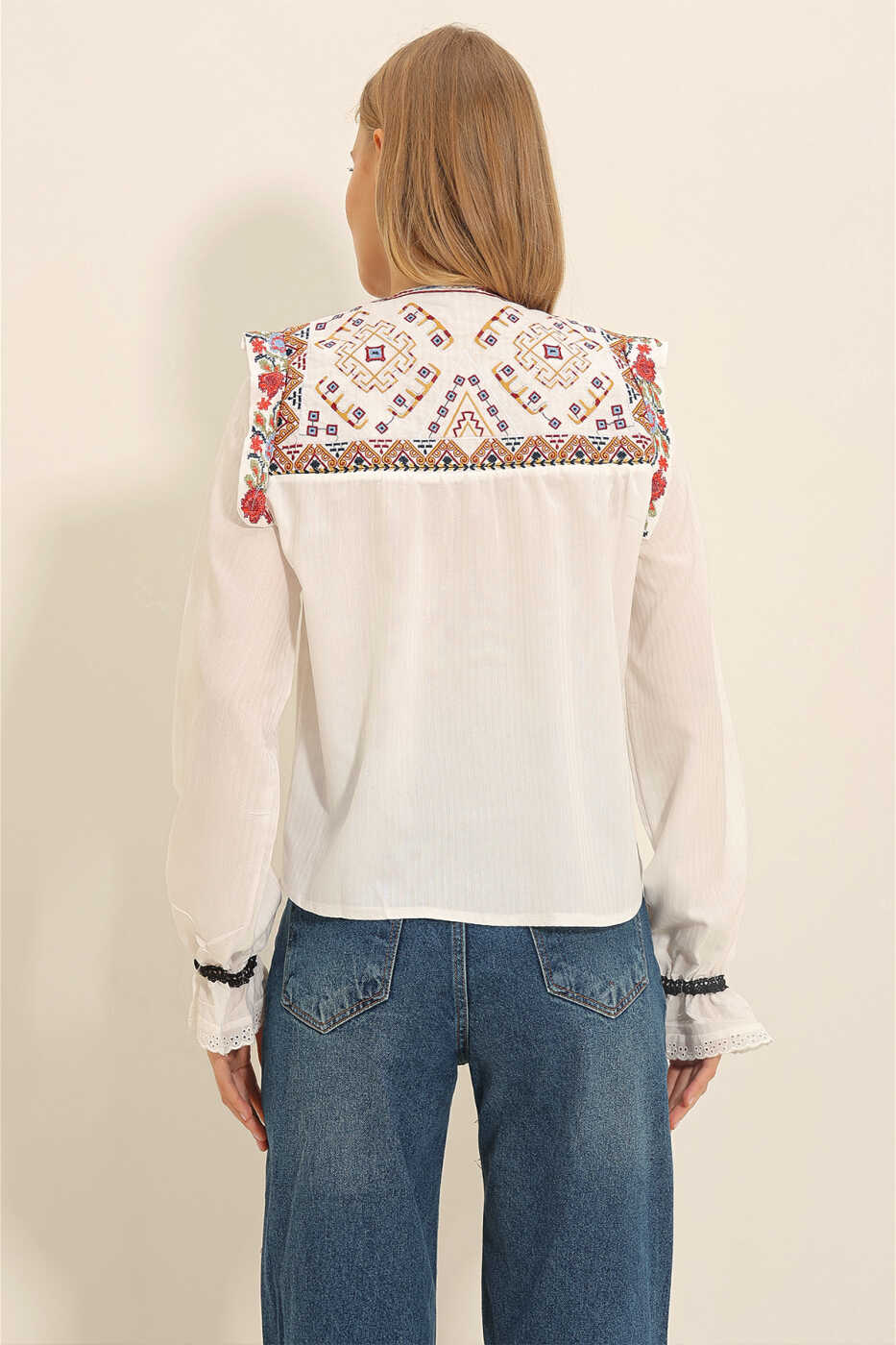 Закажите прямо сейчас и испытайте разницу, которую женская белая блуза с круглым вырезом и вышивкой в стиле роба привносит в ваш стиль!