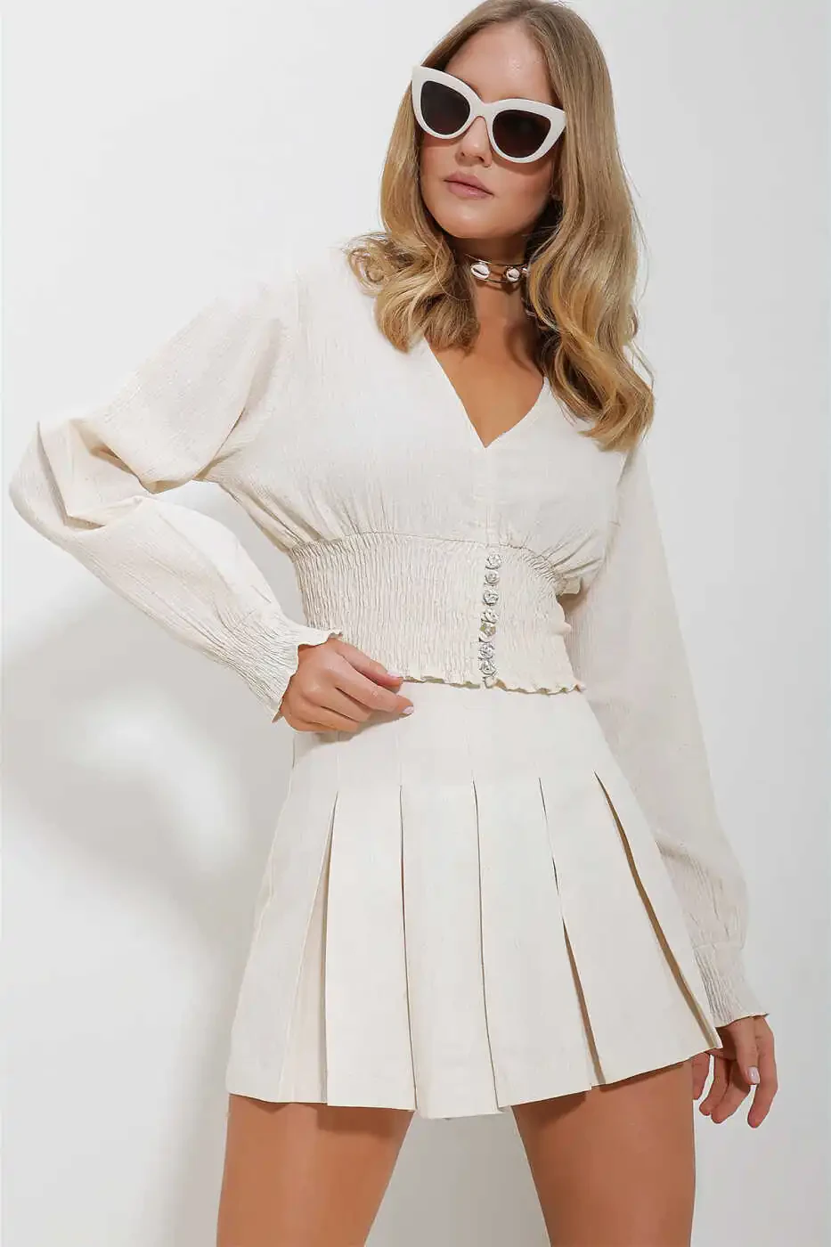 Сочетая в себе комфорт и стиль, эта бежевая кроп-блуза станет незаменимой частью вашего гардероба. Изготовленная из натуральной льняной ткани, блуза обладает мягкой текстурой, приятной на ощупь, а V-образный вырез и завязка на талии с бантом придают ей женственный вид. Благодаря рубашечному дизайну на пуговицах, блуза сочетает в себе комфорт и элегантность, что делает ее подходящей для повседневной носки или особых случаев.