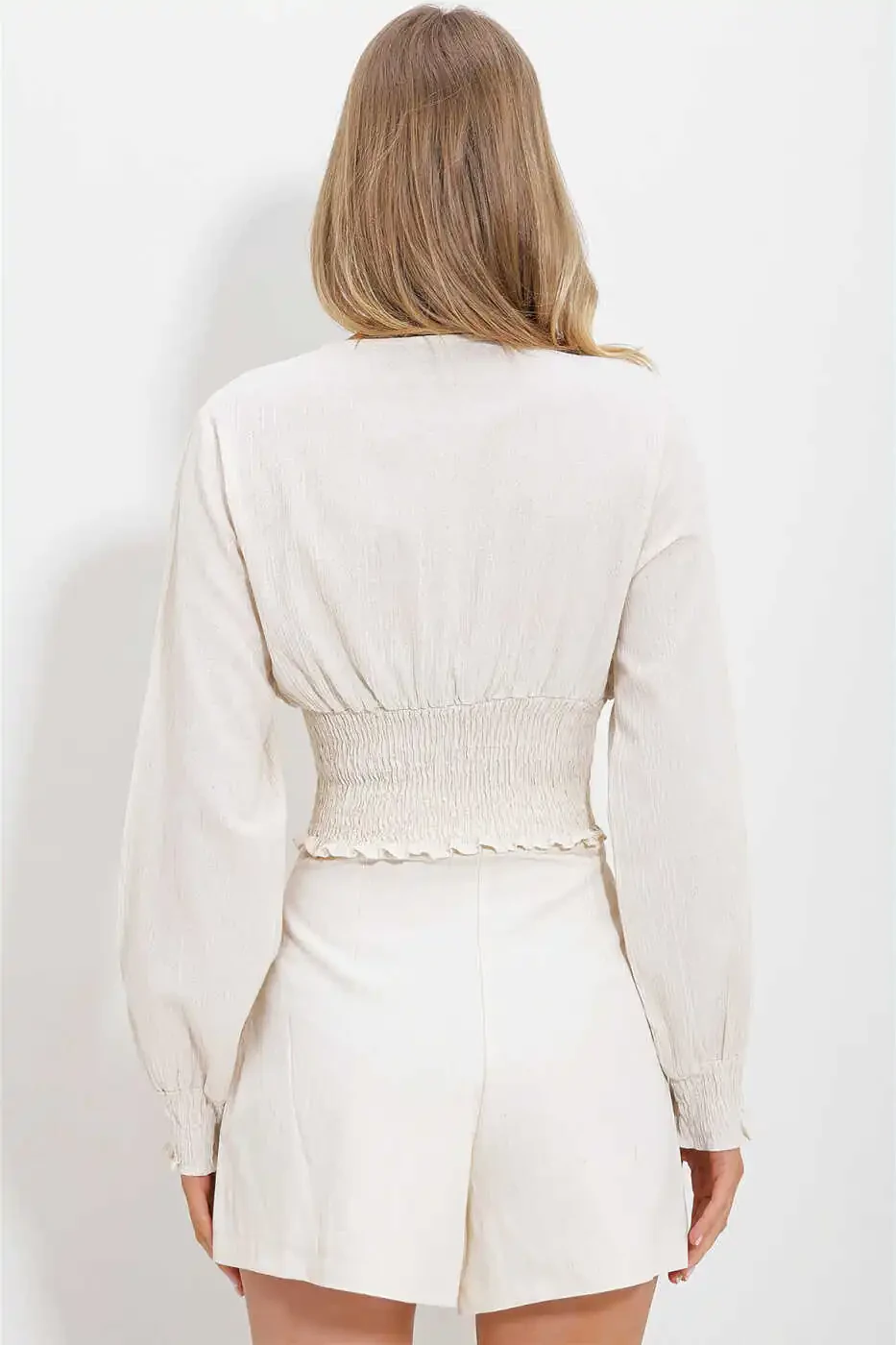 женская блуза, кроп-блуза, льняная блуза, бежевая блуза, блуза с V-образным вырезом, блуза с завязкой на талии, блуза на пуговицах, летняя блуза, женская одежда, стильная блуза, удобная блуза, ALC-X11656