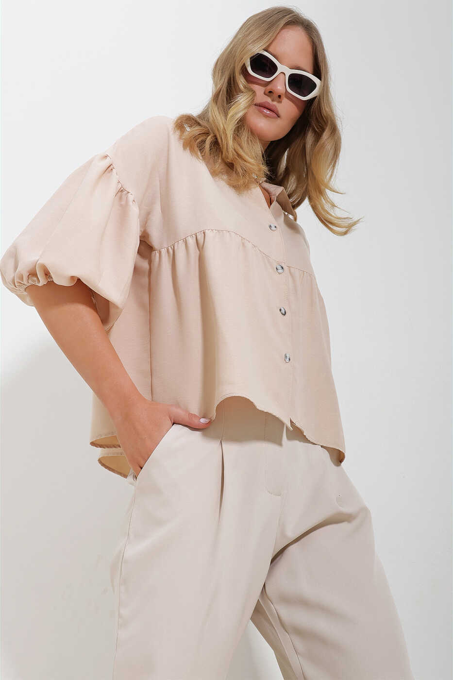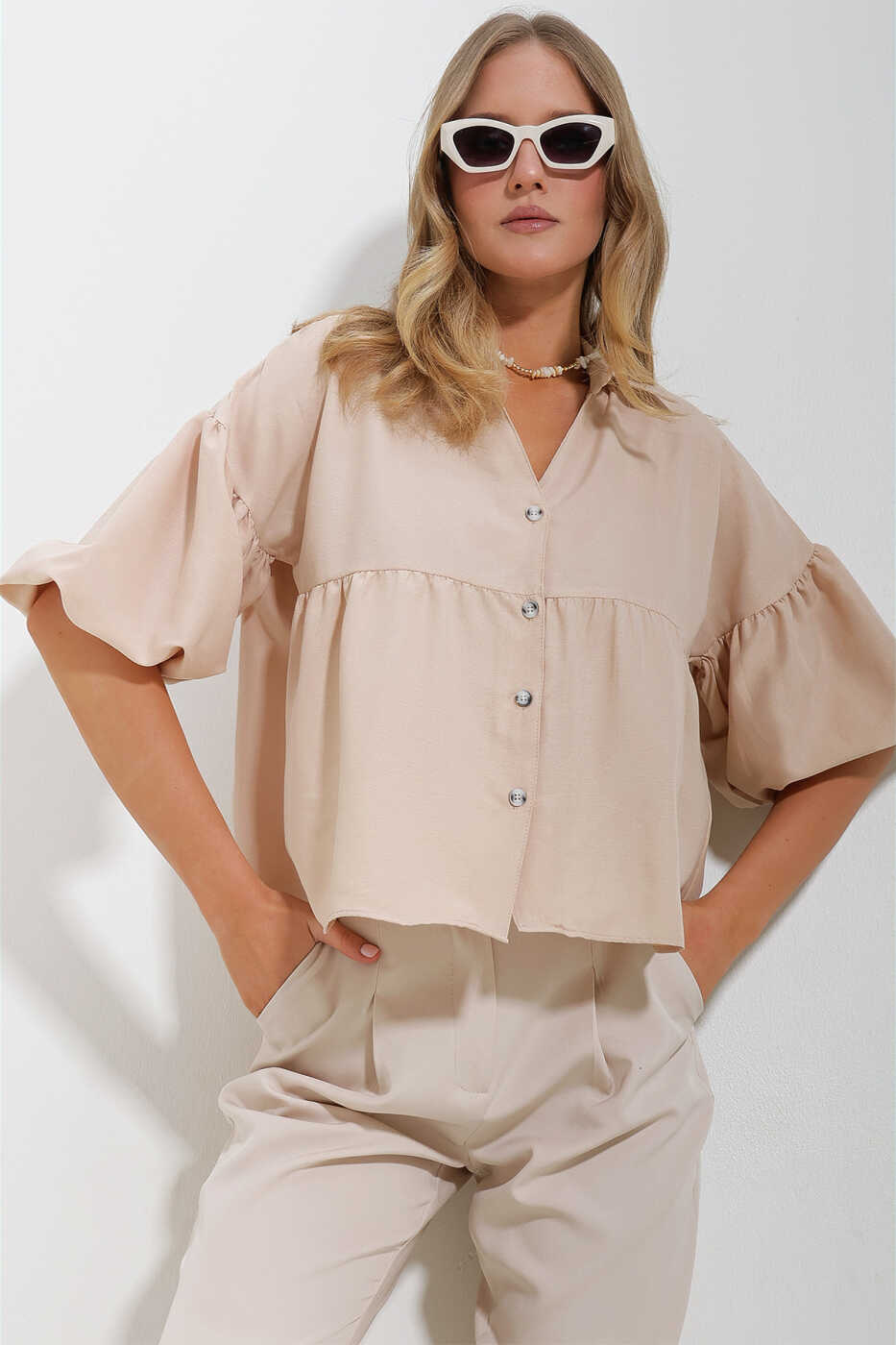 Приготовьтесь чувствовать себя стильно и комфортно с женской бежевой рубашкой с рукавами-буфами и сборками из купра-хлопка ALC-X11624!