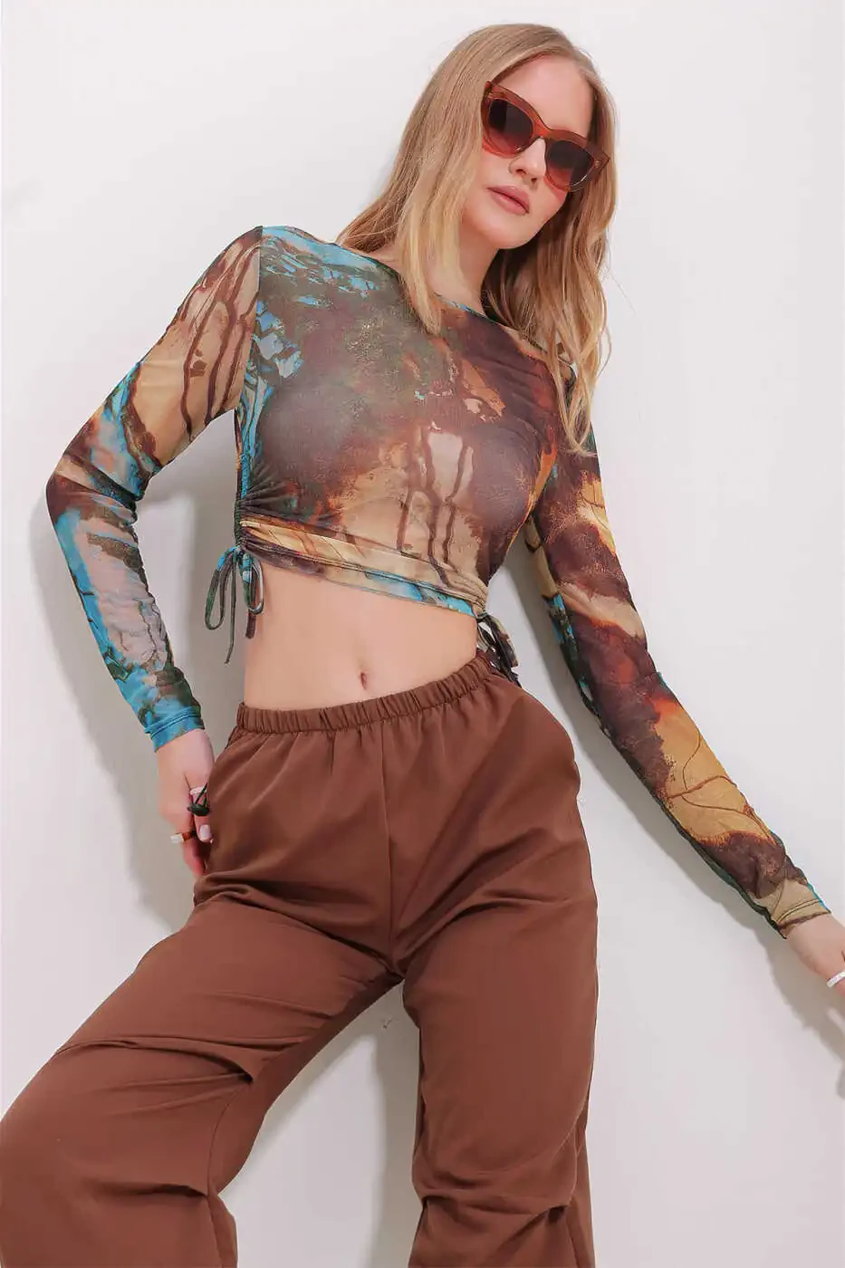 С Женской Кофейной Футболкой с Воротником-Гольф с Цифровым Принтом и Рюшами на Боках из Тюля Кроп ALC-X11528, подарите своему гардеробу стиль и комфорт одновременно!
