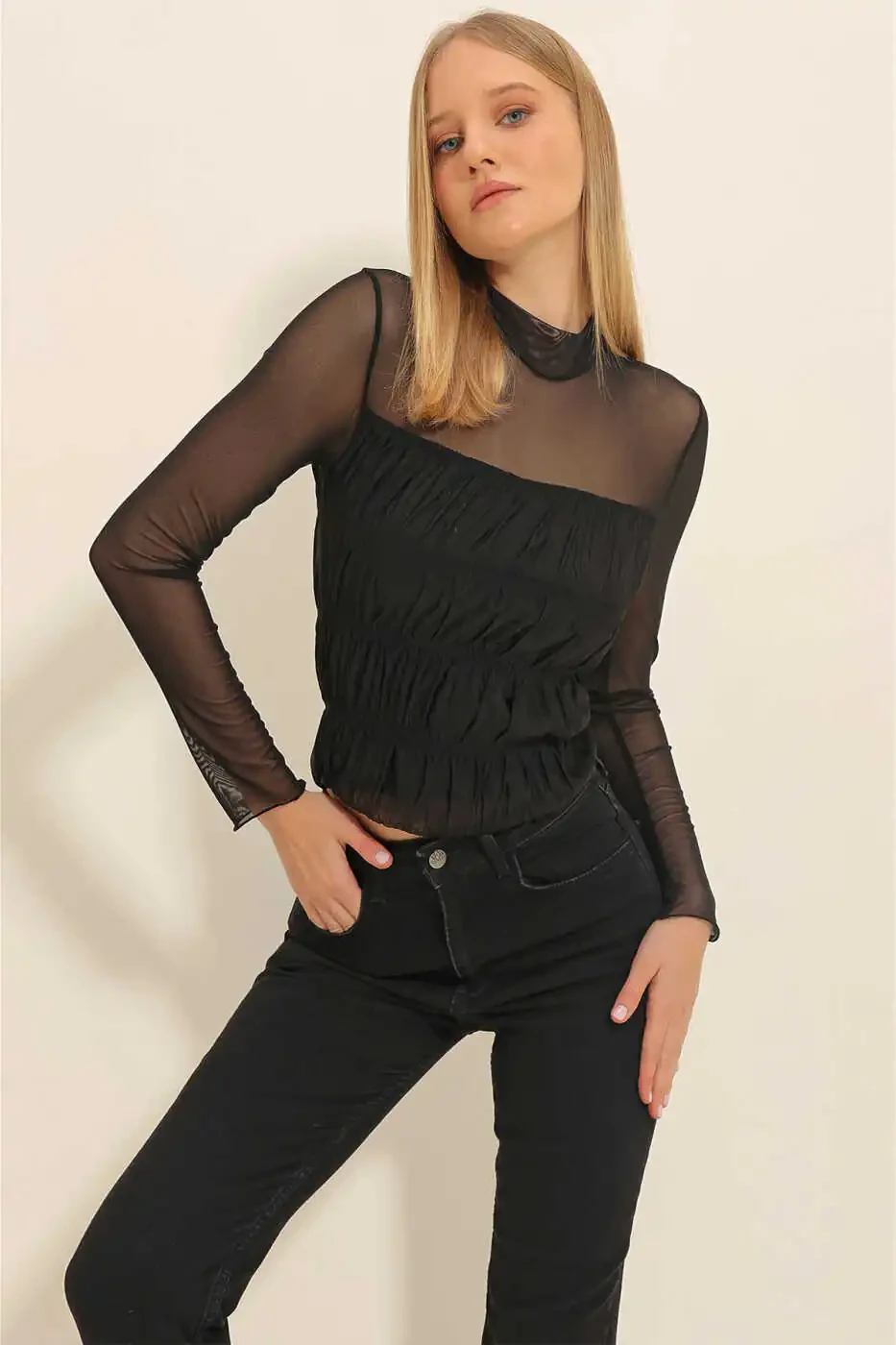 Продемонстрируйте свой стиль с помощью женской черной блузы с воротником-гольфом и тюлевыми деталями ALC-X11308, которая сочетает в себе элегантность и женственность! Эта блуза с элегантным воротником-гольфом и стильными тюлевыми деталями создает потрясающий образ, который подойдет к любому стилю.