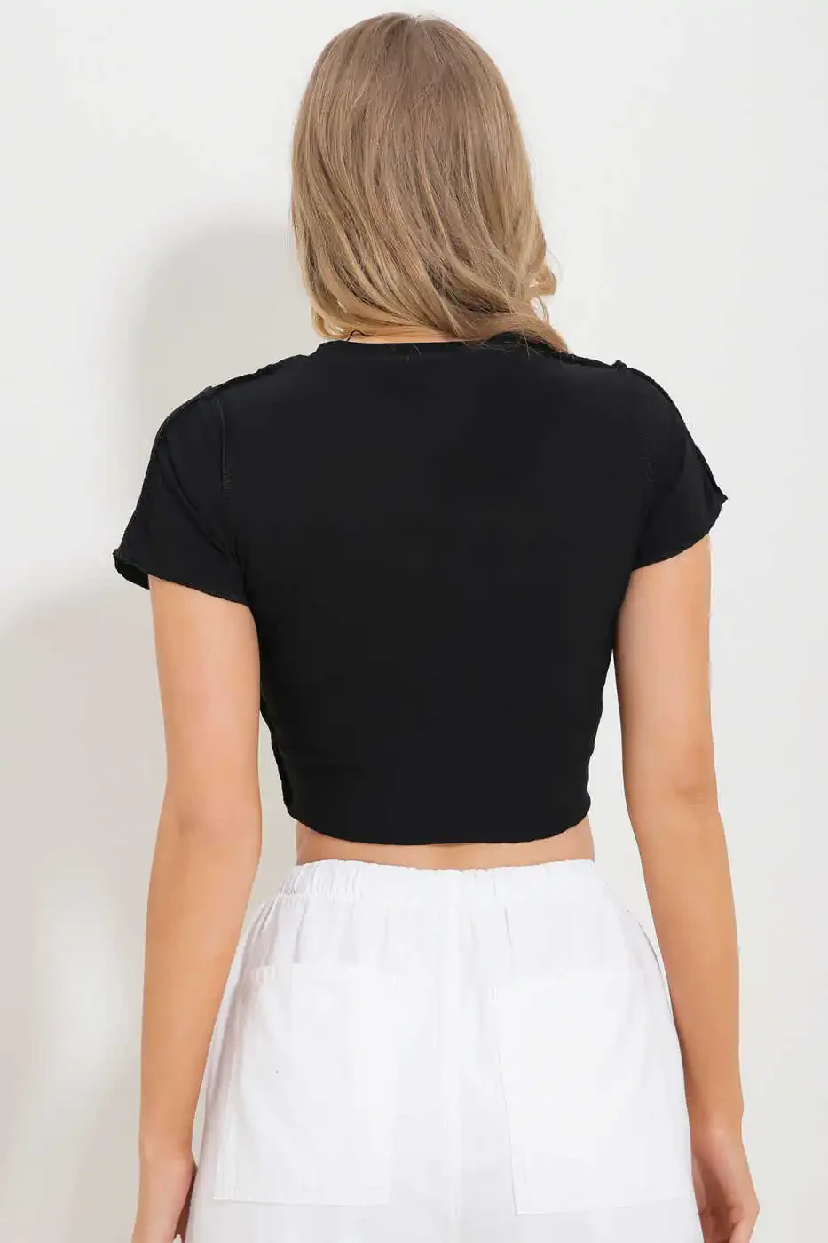 Дополните свой стиль женской черной блузкой кроп с воротником-хомутом и декоративной строчкой спереди Alc-X11782, которая сочетает в себе элегантность и комфорт! Ее мягкая и дышащая ткань обеспечивает комфорт в течение всего дня. Воротник-хомут и стильная декоративная строчка спереди создают современный и женственный образ. Модель кроп адаптируется к любому типу фигуры, создавая стильный и современный силуэт.