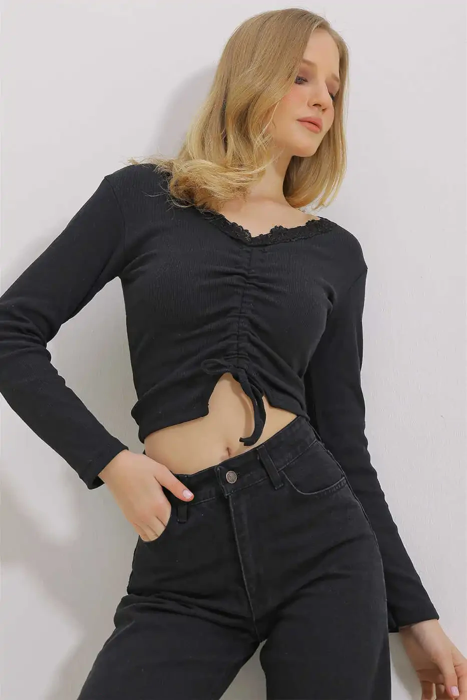 Завязанный ворот спереди придает блузке женственный вид, а изящные кружевные детали подчеркивают ее элегантность. Черный цвет - это классический выбор, который подходит для любого стиля.