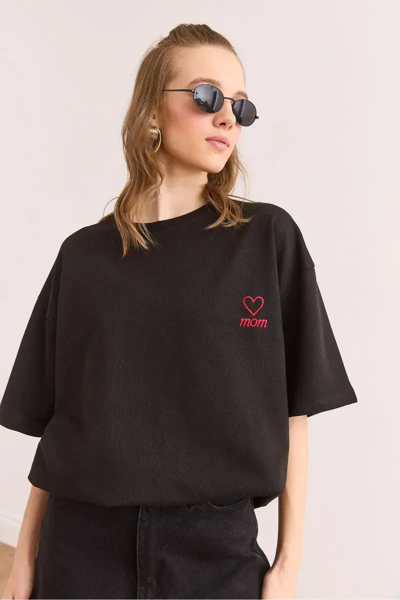 женская футболка, футболка оверсайз, mom футболка, футболка с вышивкой, черная футболка, хлопковая футболка, удобная футболка, повседневная футболка, подарочная футболка, olalook official