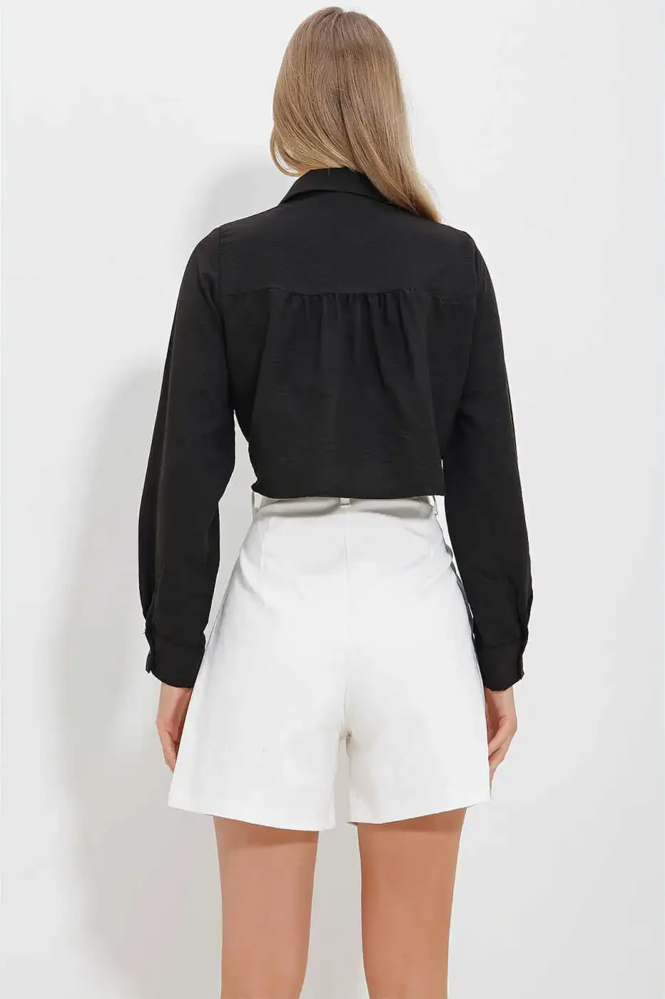 Чувствуйте себя свободно и комфортно в Женской Черной Кроп-Топ с Двумя Карманами и Завязками Спереди для Аэробики ALC-X11633!
