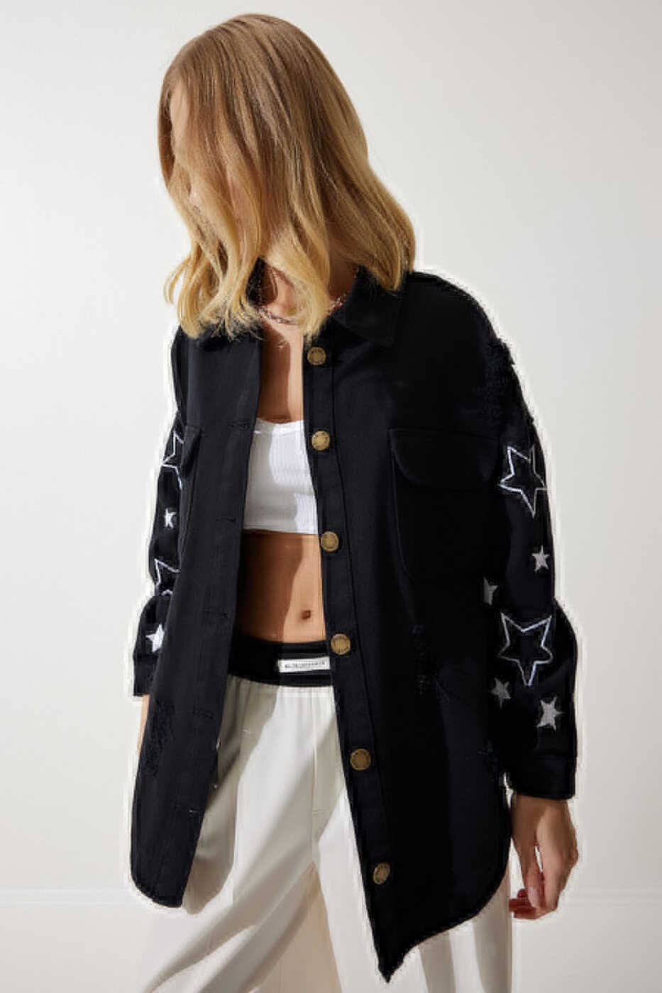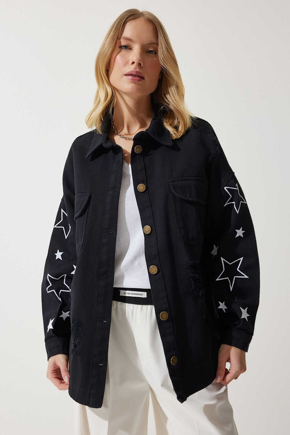 Женская черная куртка-рубашка оверсайз с вышивкой в виде звезд SA00026, разработанная для современных женщин, которые ищут сочетание элегантности и комфорта, станет незаменимой частью вашего гардероба! Благодаря крою оверсайз она обеспечивает комфортное ношение в течение всего дня, а детали с вышивкой в виде звезд добавляют привлекательный шик. Эта куртка из 100% хлопка имеет дышащую структуру, защищает вас от пота и в то же время балует вашу кожу своей мягкой текстурой. Воротник-стойка и базовый силуэт обеспечивают вневременную элегантность и идеально сочетаются с любым нарядом. Вы можете добавить нотку изысканности в свой стиль, выбрав эту куртку как для повседневной жизни, так и для особых случаев. Идеальный выбор для женщин, которые хотят выделиться благородством черного цвета и сиянием звездного рисунка! Оверсайз крой - отличный вариант для тех, кто ищет непринужденный и современный стиль. Этот крой обеспечивает свободный вид, не облегая фигуру, и не ограничивает вашу свободу движений. Эта куртка, идеально подходящая для повседневного использования, легко сочетается с джинсами, юбками или платьями. Вышивка в виде звезд придает куртке неповторимый характер, а черный цвет сочетается с любой одеждой. Тот факт, что ткань на 100% состоит из хлопка, позволяет вашей коже дышать и обеспечивает комфорт в течение всего дня. Кроме того, ее легко чистить в соответствии с инструкциями по стирке, и она будет выглядеть как новая в течение длительного времени. Благодаря практичным карманам вы можете носить с собой мелкие вещи, а стандартный размер и тип рукава идеально подходят вашей фигуре. Эта куртка - идеальный выбор для современных женщин, которые ищут стильный и в то же время удобный образ. Прочная ткань обеспечивает длительное использование, а привлекательный звездный узор поможет вам привлечь внимание в любой обстановке.