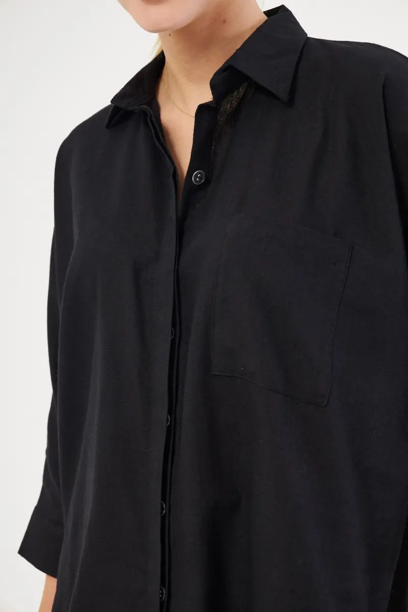 Женская черная льняная рубашка свободного кроя с карманами – это универсальная вещь, которая адаптируется к динамичному образу жизни современной женщины. Дышащая структура льняной ткани обеспечивает ощущение прохлады и свежести, особенно в жаркую погоду. Свободный крой обеспечивает комфорт, не ограничивая свободу движений, и в то же время изящно подчеркивает естественные линии вашей фигуры. Вечная элегантность черного цвета позволяет легко сочетать рубашку с различными комбинациями. Создайте ли вы спортивный образ с джинсами или более элегантный стиль с юбкой или шортами, эта рубашка всегда будет правильным выбором. Карманы спереди рубашки обеспечивают не только функциональную деталь, но и придают дизайну современный вид. Карманы идеально подходят для ношения с собой мелких предметов. Детали швов и качественное исполнение рубашки обещают долговечность. Чтобы черный цвет не выцветал и ткань сохраняла свою форму, необходимо соблюдать условия стирки. Эта рубашка – не просто предмет одежды, а отражение образа жизни. Она позволяет вам свободно выражать свой стиль и всегда выглядеть стильно и ухоженно. Эта рубашка, которую можно легко сочетать с другими вещами в вашем гардеробе, будет сопровождать вас как в повседневных делах, так и на особых мероприятиях. Женская черная льняная рубашка свободного кроя с карманами – идеальный выбор для женщин, которые ищут сочетание комфорта и стиля, и является ключом к стильному и уверенному образу.