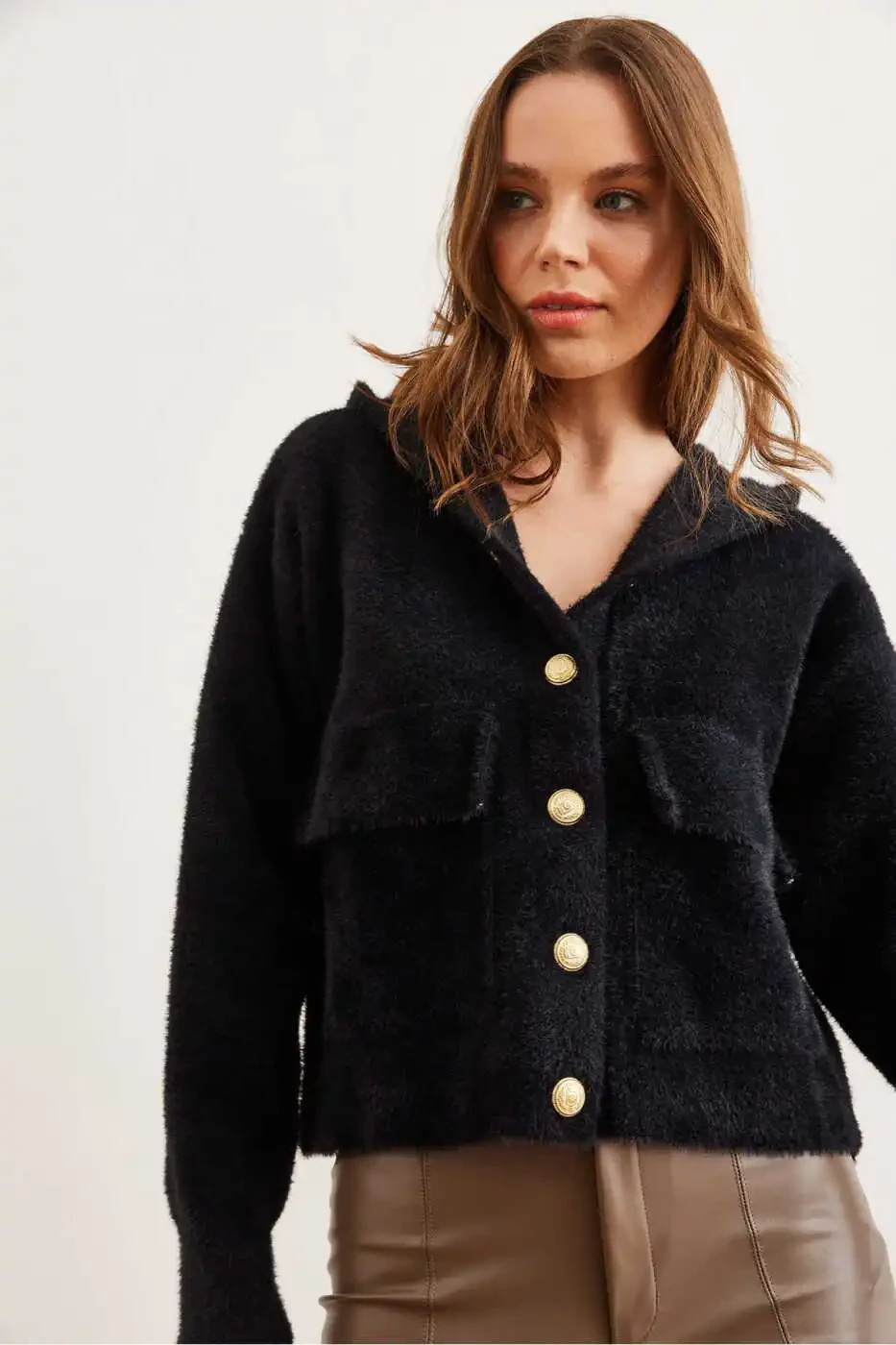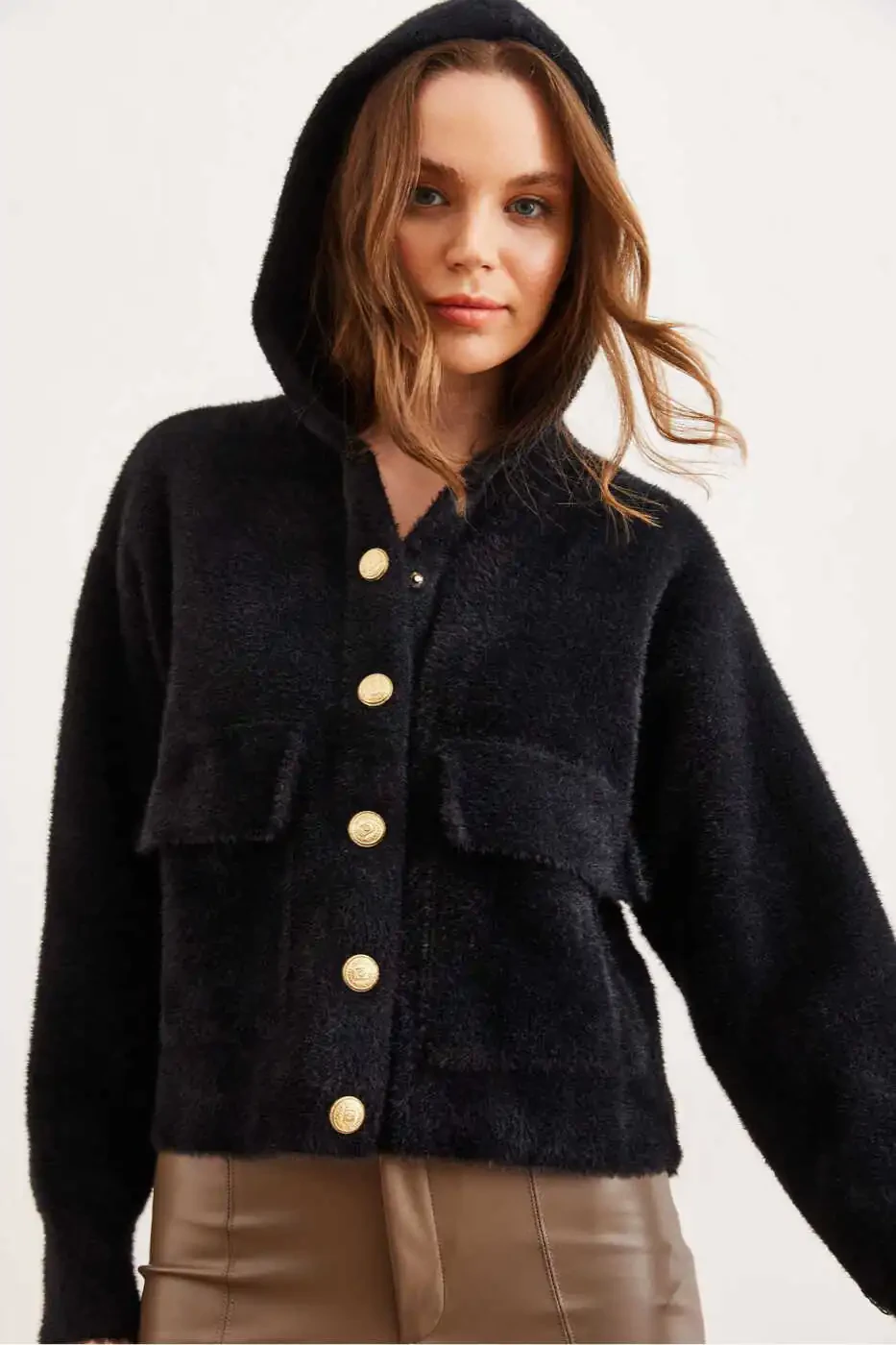 **Женский черный кардиган с капюшоном и карманами из мягкого материала грубой вязки HRK-19000325**Этот ультрамягкий и уютный кардиган создан для того, чтобы вы чувствовали себя стильно и комфортно в холодные зимние дни.**Характеристики:*** **Материал:** 100% хлопок* **Цвет:** Черный* **Длина/обхват груди:** 53/48 см* **Параметры модели:** Рост: 1,74, Обхват груди: 80, Обхват талии: 60, Обхват бедер: 90* **Размер:** Стандартный* **Цена по акции:** В наличии более 50 единиц* **Возврат:** Бесплатный возврат в течение 15 дней* **Гарантия Trendyol:** Доставка от Trendyol**Стиль:**Благодаря дизайну с капюшоном и вместительным передним карманам этот кардиган одновременно стильный и функциональный. Его мягкая текстура и толстая вязка согреют вас, а черный цвет легко сочетается с любым нарядом.**Комфорт:**Изготовленный из 100% хлопка, этот кардиган нежно облегает кожу и обеспечивает комфорт на весь день. Глубокий капюшон защищает голову и шею, а передние карманы согревают руки.**Качество:**Этот кардиган, изготовленный из высококачественных материалов и с тщательным мастерством, создан для долгой службы. Его черный цвет не выцветает, а мягкая текстура сохраняется.