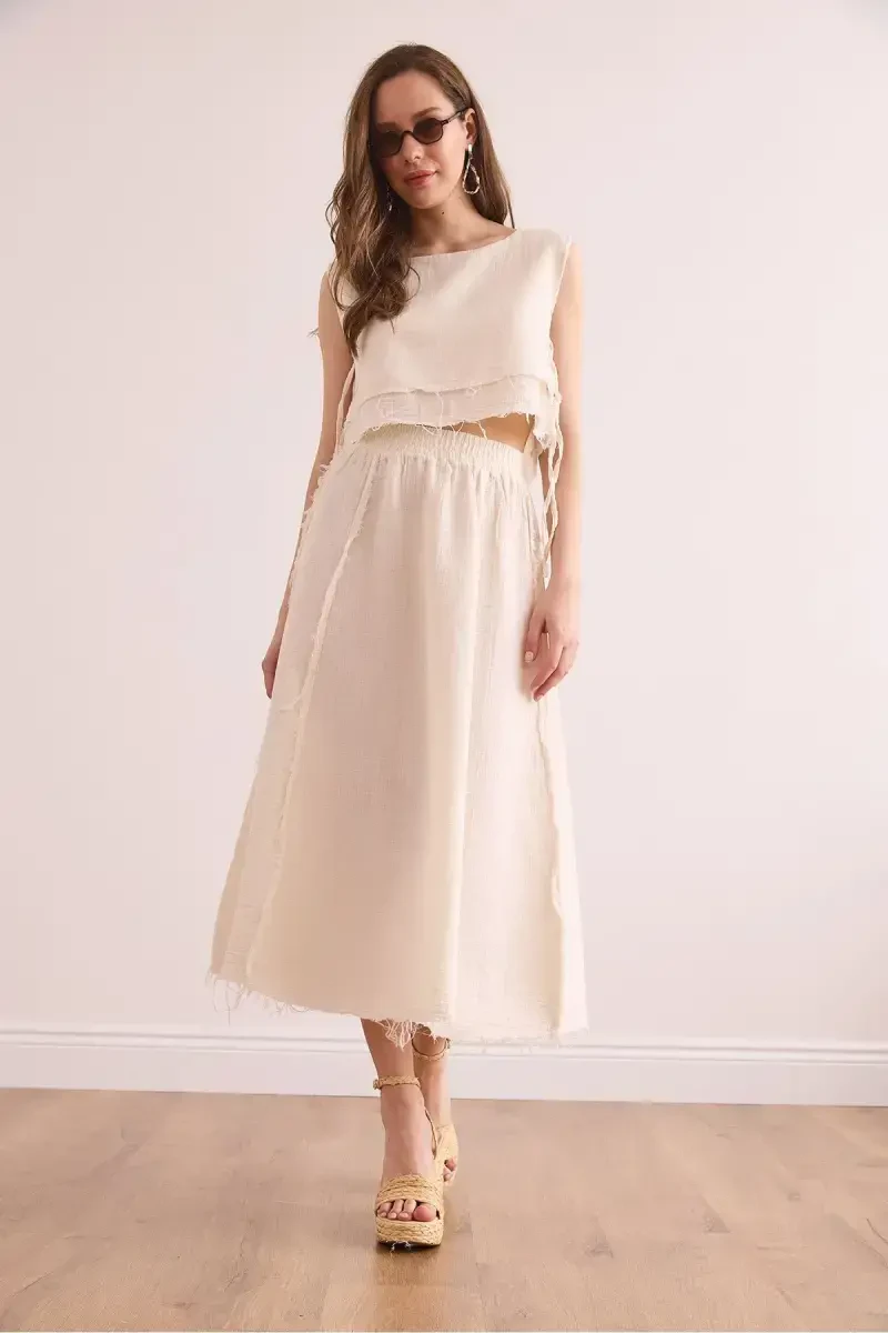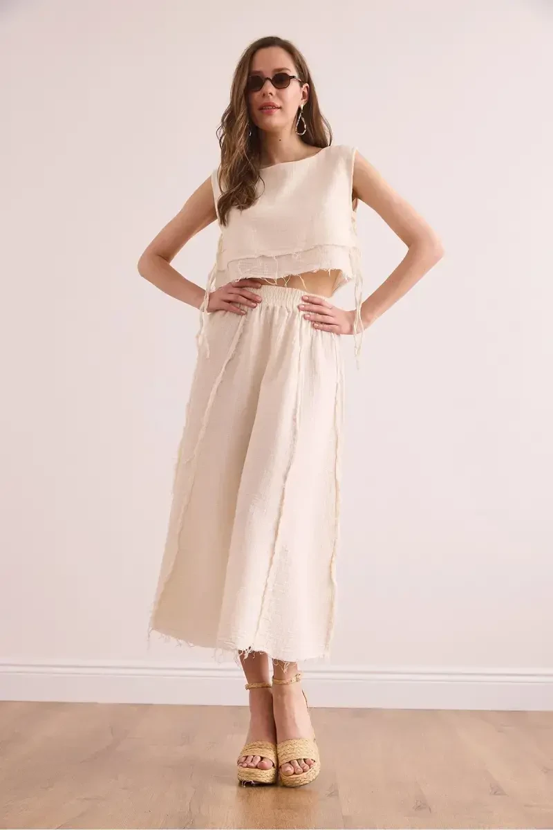 Добавьте естественности и комфорта своему стилю с женской экрю юбкой из муслина с эластичной талией и небрежным швом. Эта эксклюзивная юбка предлагается вам с гарантией olalook official. Благодаря легкости муслиновой ткани и хлопковой текстуре вы будете чувствовать себя комфортно в течение всего дня. Юбка идеально сидит на вашей фигуре благодаря эластичной талии и не сковывает ваши движения. Детали небрежного шва придают юбке уникальный и современный вид, а цвет экрю подходит ко всем видам комбинаций и является кандидатом на то, чтобы стать незаменимой частью вашего гардероба. Эта юбка, которая дополнит ваш стиль как в повседневной жизни, так и на особых мероприятиях, предлагает как комфорт, так и элегантность. Благодаря опции с несколькими продавцами вы можете сравнить цены и услуги разных продавцов и выбрать наиболее подходящий вариант. Но помните, что каждый продавец может устанавливать свои собственные цены, баллы, условия доставки и рекламные акции. Поэтому перед оформлением заказа важно внимательно изучить информацию о продавце. Поторопитесь воспользоваться указанной акционной ценой, так как количество товара ограничено! Добавьте этот уникальный предмет в свой гардероб и наслаждайтесь комфортом и элегантностью. Эта юбка, которая поднимет ваш повседневный стиль на новый уровень, станет одной из ваших любимых вещей в гардеробе. Дышащая структура муслиновой ткани позволяет вам чувствовать себя комфортно, не потея даже в жаркую погоду. Юбка является идеальным выбором как для спортивных, так и для классических стилей. Вы можете создать повседневный образ с футболкой и кроссовками или пойти на элегантный ужин с блузкой и туфлями на каблуках. Эластичная талия помогает ей адаптироваться к разным типам фигуры, а детали небрежного шва придают юбке современный и уникальный вид. Цвет экрю легко сочетается с любыми предметами верхней одежды и аксессуарами, что позволяет создавать разные стили. Благодаря 100% хлопковому составу он не повреждает кожу и сводит к минимуму риск аллергических реакций. Поэтому это также подходящий вариант для людей с чувствительной кожей. Женская экрю юбка из муслина с эластичной талией и небрежным швом - идеальный выбор для женщин, которые ищут комфорт и элегантность в одном. С этой эксклюзивной юбкой вы привлечете внимание в любой обстановке.