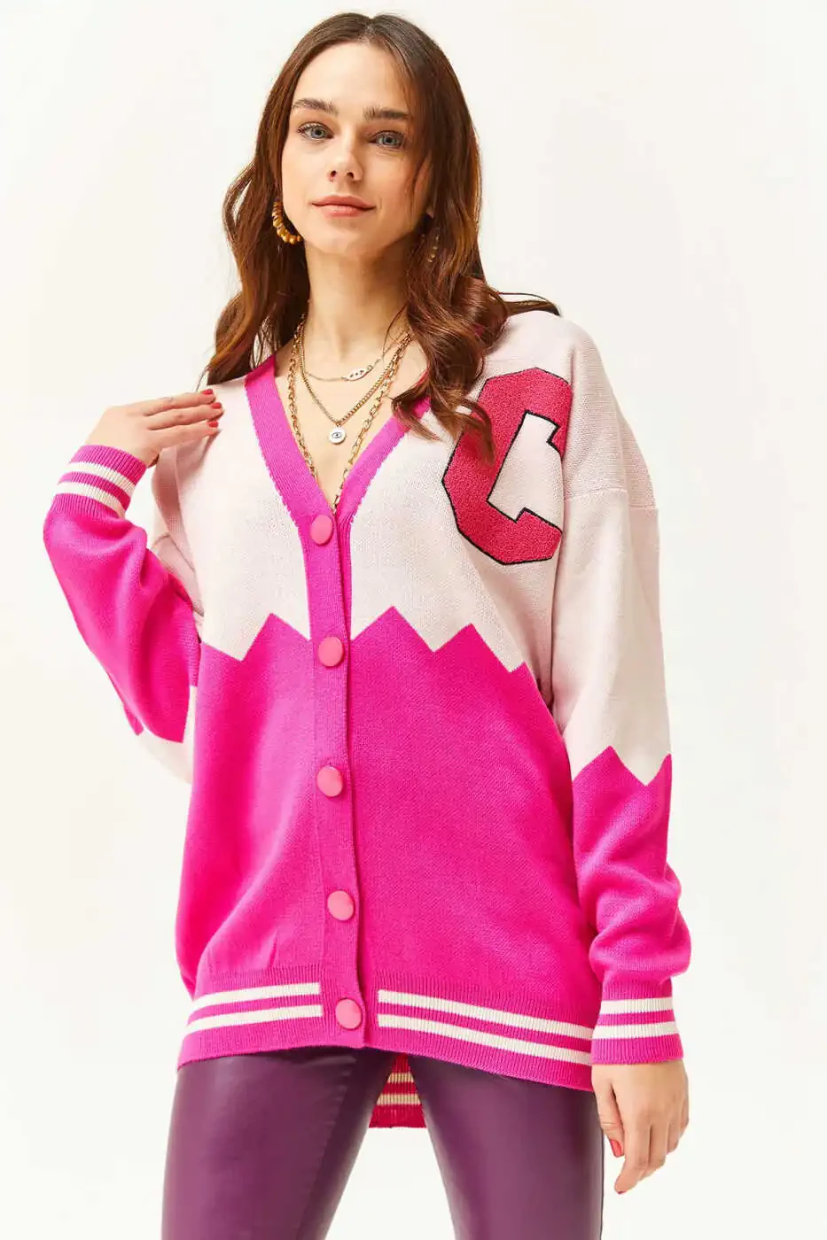 **Женский вязаный кардиган большого размера с зигзагообразным рисунком и буквами цвета фуксии HRK-19000277****Характеристики продукта:*** **Цвет:** Фуксия* **Рисунок:** Зигзаг с буквами* **Тип воротника:** Велосипедный воротник* **Тип рукава:** Стандартный рукав* **Материал:** 100% акрил* **Силуэт:** Базовый* **Посадка:** Обычная* **Крой:** Обычный крой* **Инструкции по уходу:** Тип 1**Описание продукта:**Этот однотонный кардиган цвета фуксии станет незаменимой вещью в вашем гардеробе и подойдет для людей любого возраста. Благодаря современному и стильному велосипедному воротнику он идеально подходит для повседневного использования. Ткань полотняного переплетения обеспечивает как прочность, так и комфорт, что делает его пригодным для длительного использования. Стандартный дизайн рукава обеспечивает свободу движений и подходит для любых видов деятельности. 100% акриловый материал обеспечивает мягкую текстуру и простоту в уходе, поэтому вы можете легко выбирать его каждый день. Достигая простого и элегантного вида благодаря своему базовому силуэту, обычная посадка адаптируется к линиям вашего тела. Благодаря акриловому материалу он легкий и обладает теплоизоляционными свойствами, обеспечивая идеальную защиту в холодную погоду. Его можно легко чистить в соответствии с инструкциями по стирке типа 1, что гарантирует, что ваш кардиган останется как новый.