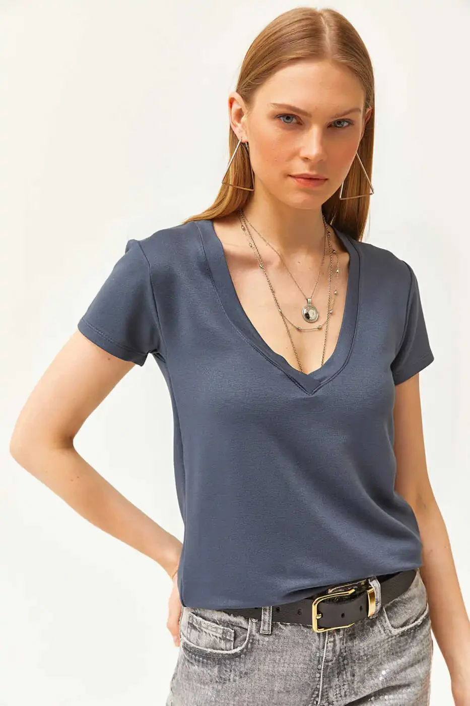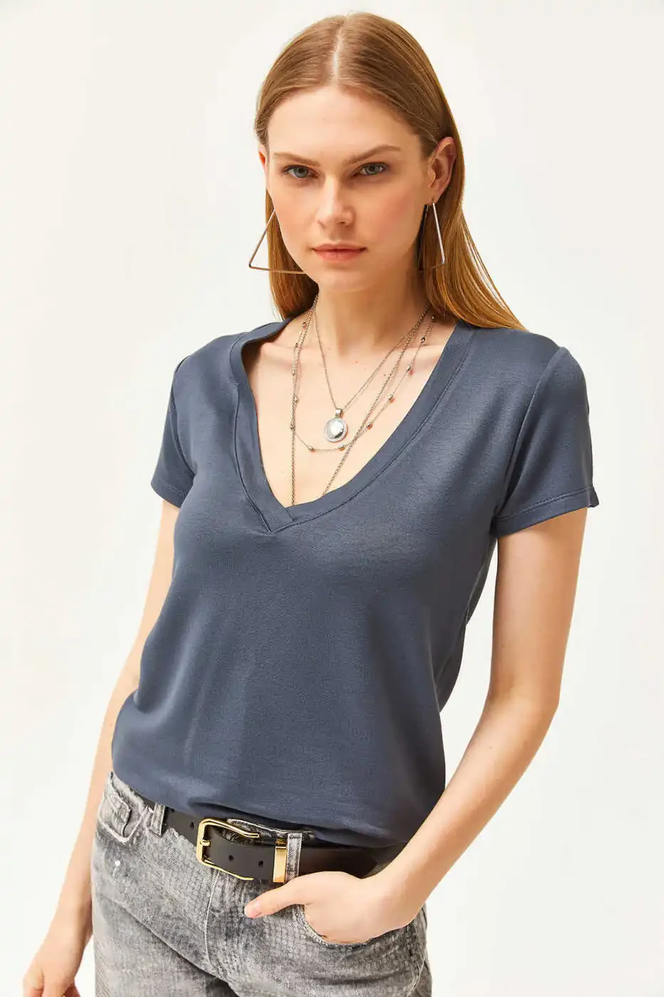 Женская футболка из модала с глубоким V-образным вырезом и пуговицами цвета антрацит TSH-19000773 - Стильная и удобная