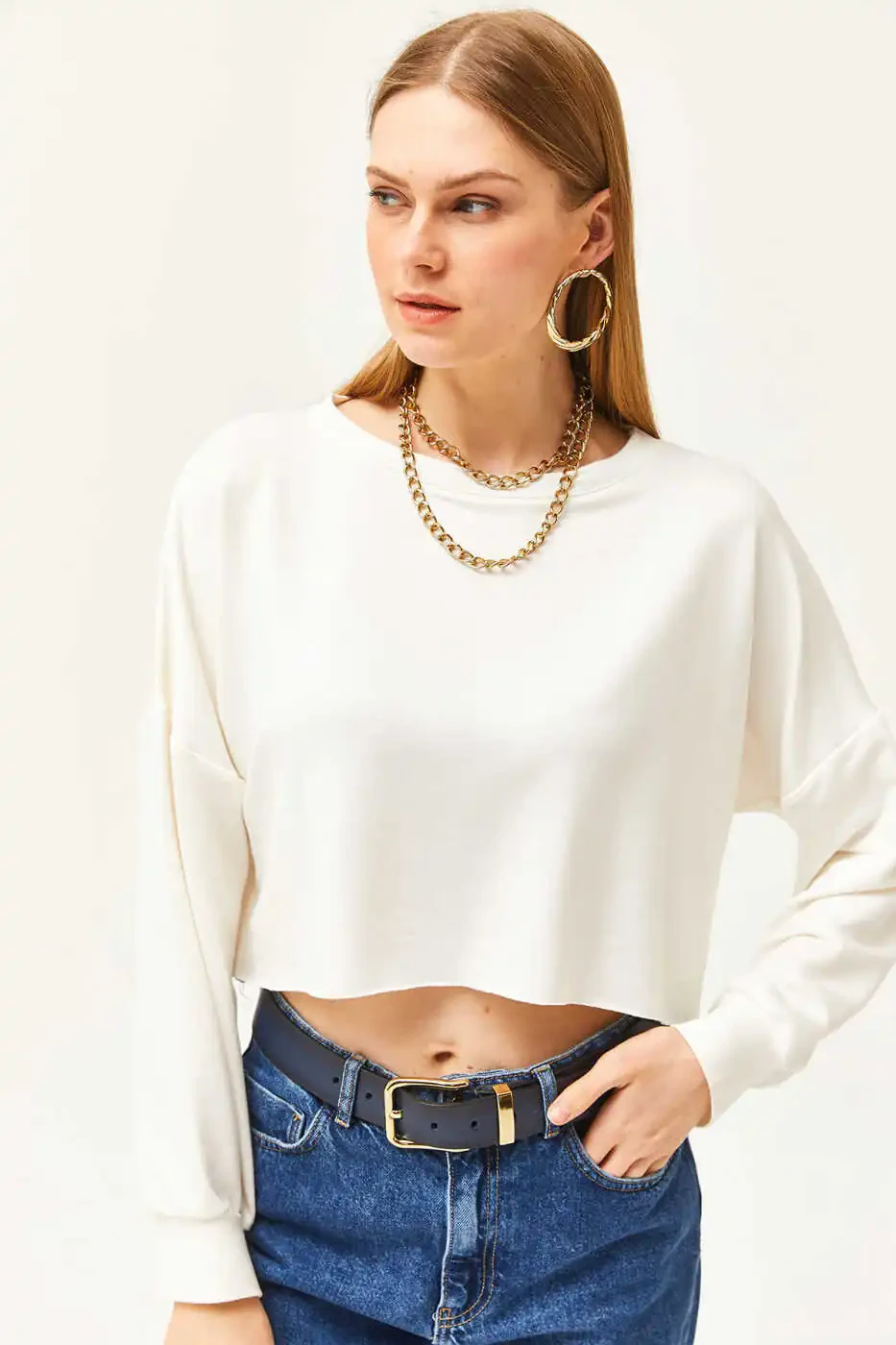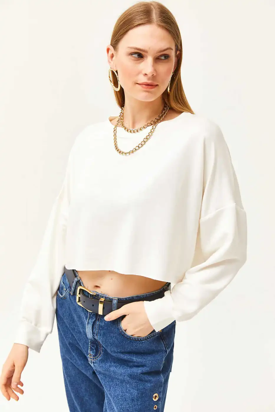 Как сочетать женскую футболку кроп-топ с летучей мышью из мягкого модала с ворсом, цвета экрю TSH-19000776: