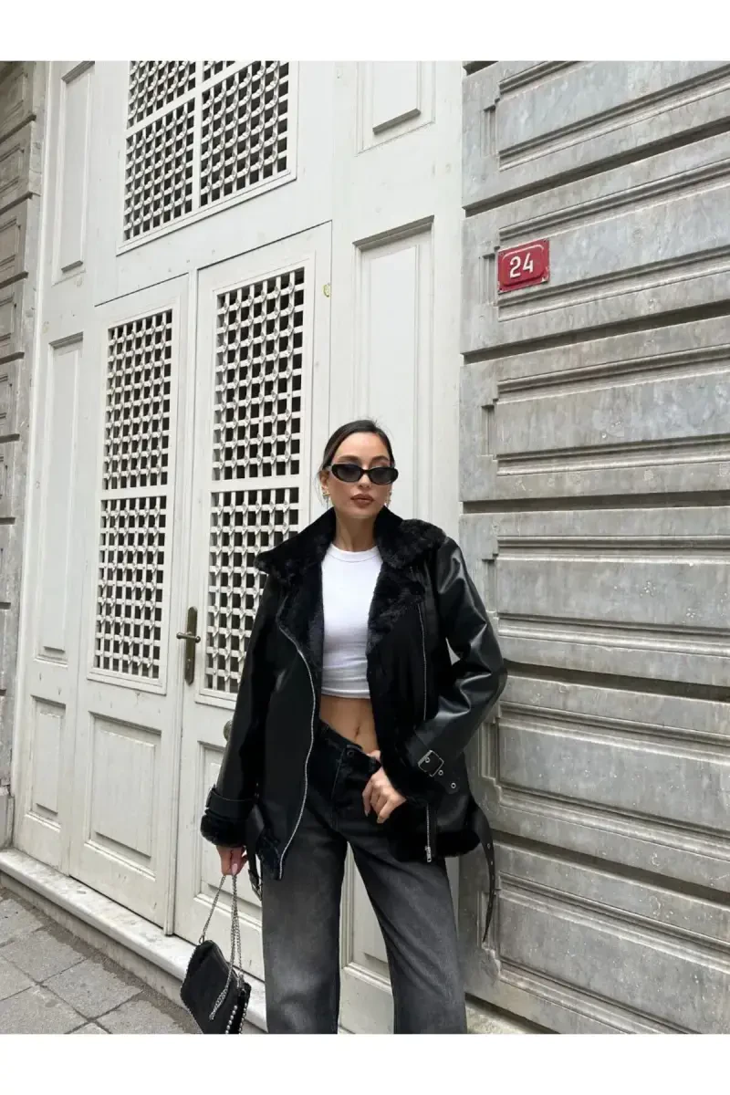 Женская байкерская куртка оверсайз из искусственной кожи с мехом от MEECY - идеальное дополнение к вашему гардеробу благодаря гармонии черного и бежевого цветов. Специальный дизайн, подходящий для всех возрастных групп, привлекает широкую аудиторию и дополняет стиль каждого. Ткань из искусственной кожи придает куртке как прочность, так и элегантный вид, обеспечивая длительное использование. Деталь в виде воротника-рубашки умело сочетает классические и современные линии, обеспечивая идеальную гармонию с любым сочетанием. Эта куртка, отражающая уникальную концепцию дизайна коллекции "Design", станет первым выбором стильных женщин. Средняя плотность делает ее идеальным выбором для межсезонья и согревает вас в холодную погоду. Модель в стиле байкера создает эффектный силуэт, а длинный крой изящно подчеркивает ваши формы. Изготовленная из 100% искусственной кожи, она является экологически чистым вариантом и поддерживает этичную и устойчивую моду. Соответствие инструкции по стирке Type1 обеспечивает легкую чистку куртки и сохранение ее в первозданном виде в течение длительного времени. Повседневный стиль, идеально подходящий для повседневного использования, сочетает в себе комфорт и элегантность. Сочетайте ли вы ее с джинсами или платьями, вы всегда будете выглядеть стильно и оригинально. Женская байкерская куртка оверсайз из искусственной кожи с мехом - это не просто предмет одежды, это выражение стиля. В этой куртке вы будете выделяться в любой обстановке и ваш стиль будет говорить сам за себя. Благодаря своей всесезонности она всегда будет с вами и добавит вашим нарядам особую атмосферу. Не упустите эту уникальную вещь, которая обязательно должна быть в вашем гардеробе. Эта куртка, сочетающая в себе элегантность и комфорт, создана специально для вас.