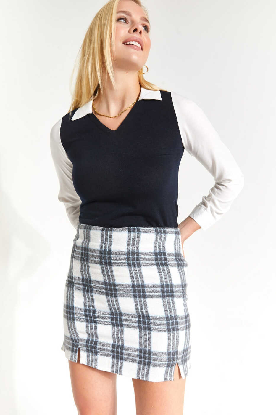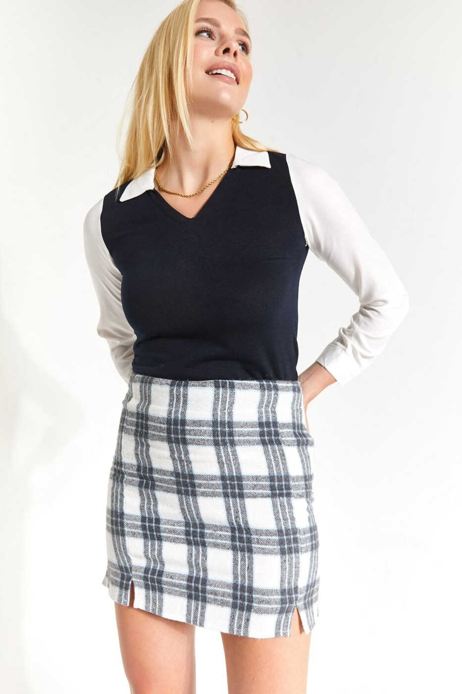 Сочетая стиль и комфорт, женская мини-юбка в клетку с голубым оттенком, сшитая со шлицами, готова стать незаменимой частью вашего гардероба. Юбка, которая выделяется своим ярким голубым клетчатым рисунком, предлагает женственный образ с элегантными деталями строчки и стильными разрезами. Сшитая из мягкой и дышащей ткани, юбка обеспечивает комфорт в течение всего дня. Это идеальный выбор, чтобы создать стильный образ для ваших повседневных нарядов, вечерних мероприятий или особых случаев.
