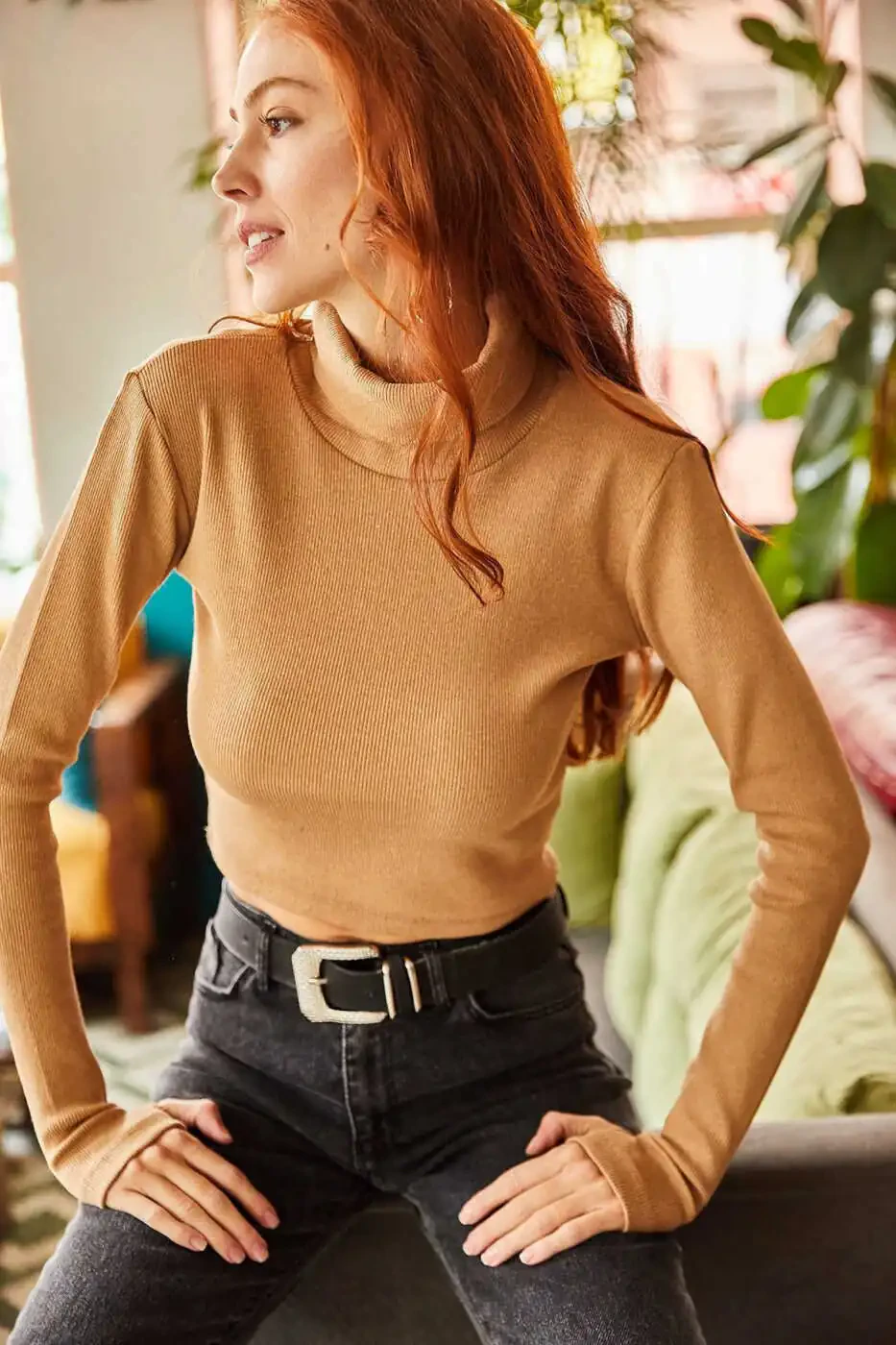 Укороченная блузка Camel, укороченная блузка с вырезом лодочкой, укороченная блузка с пальцами, женская укороченная блузка, укороченная блузка Trendyol