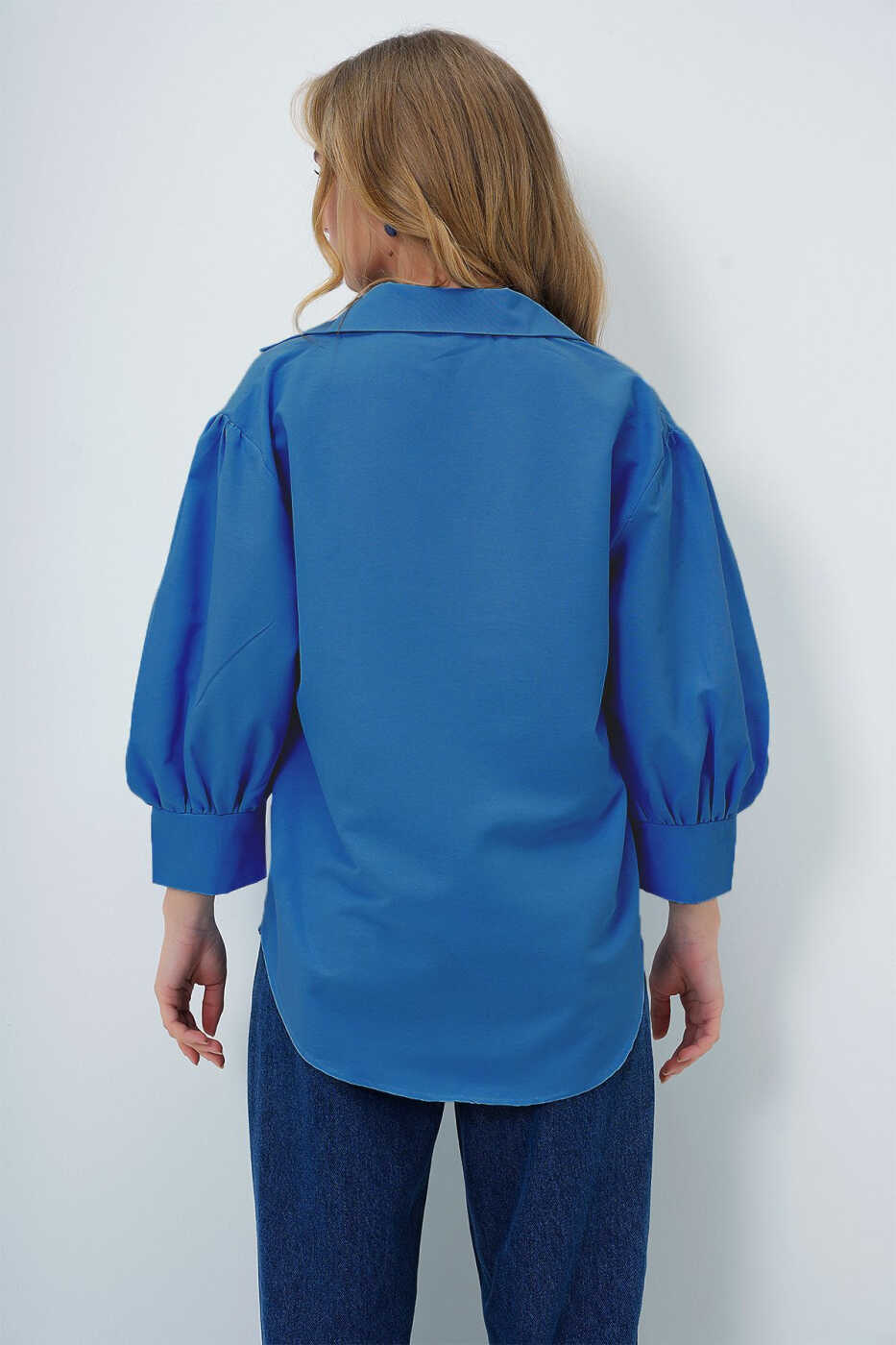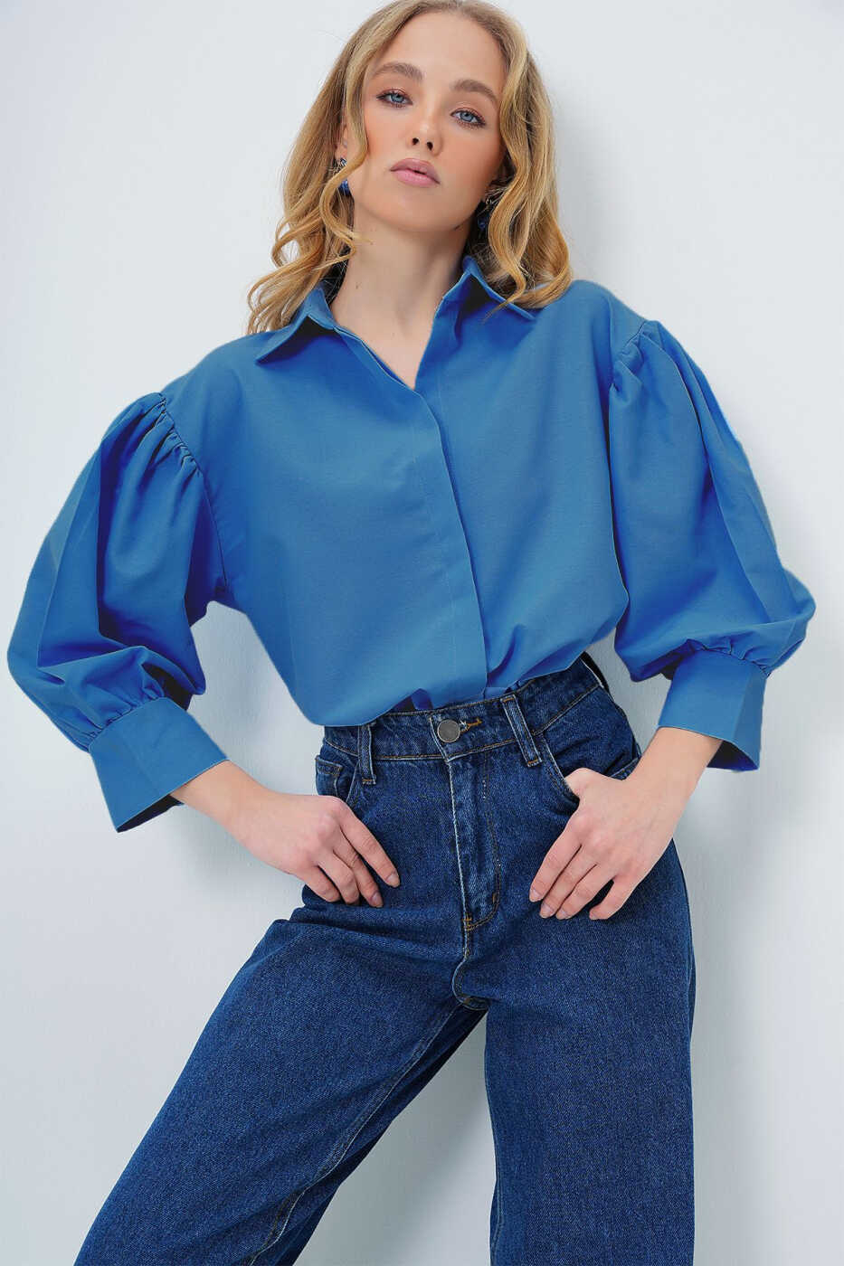 Женская рубашка из поплина с голубыми рукавами-фонариками и скрытой планкой, которая легко сочетается с любой комбинацией, позволяет вам выглядеть стильно и элегантно в повседневной жизни, деловой обстановке или на особых мероприятиях. Голубой цвет, который подходит любому тону кожи, придаст вам уверенный стиль.
