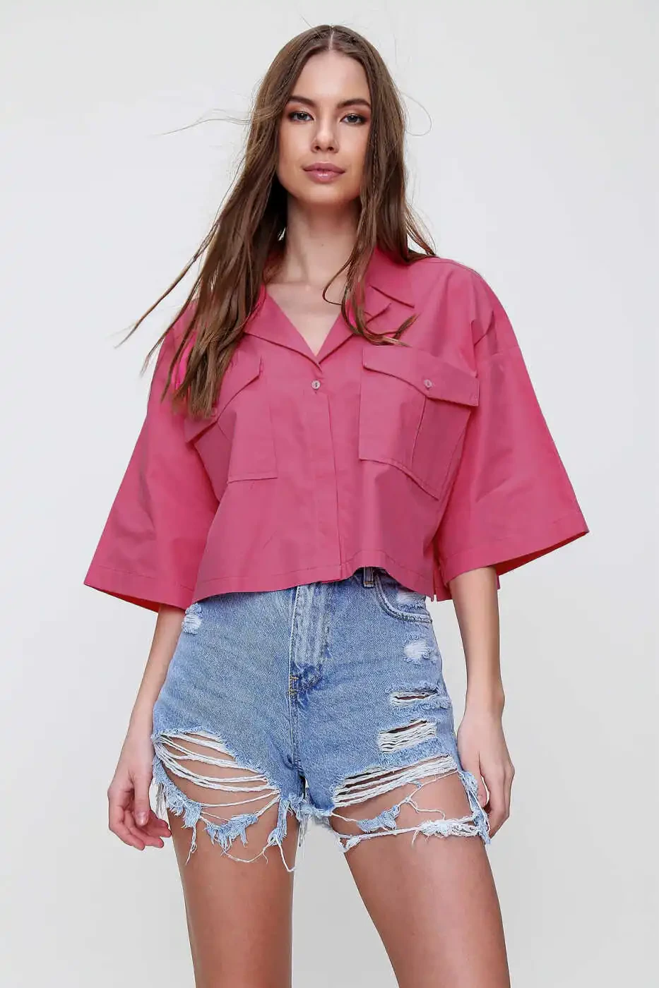 Женская фуксиевая рубашка с накладным карманом в виде конверта с коротким рукавом, сочетающая в себе стиль и комфорт, станет новым любимым предметом вашего гардероба. Рубашка, выделяющаяся своим элегантным фуксиевым цветом и коротким кроем, обеспечивает комфортное использование в течение всего дня благодаря дышащей структуре поплиновой ткани. Деталь с накладным карманом в виде конверта обеспечивает как стильный вид, так и практическое использование.