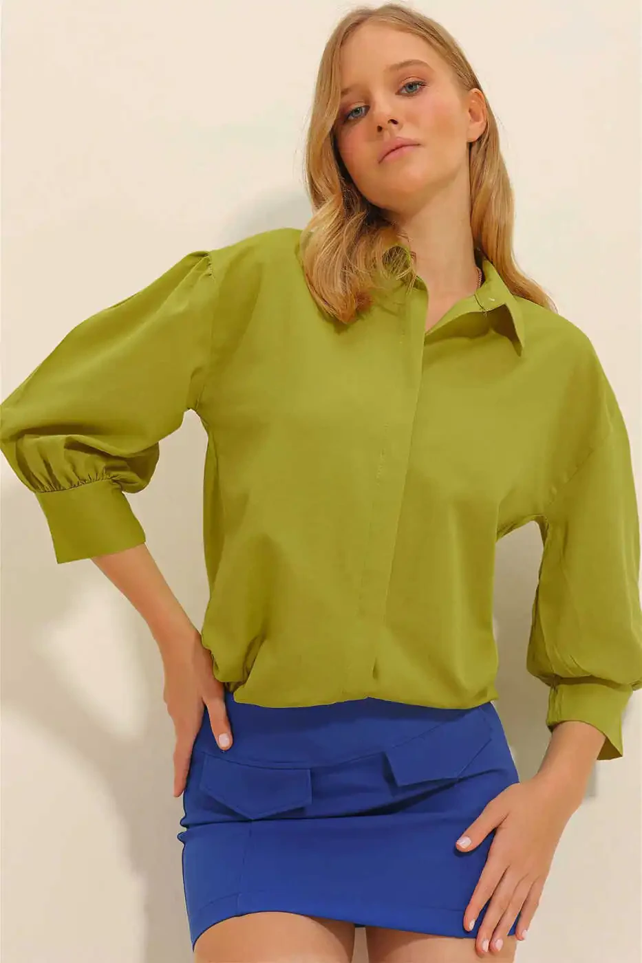 Женская рубашка из поплина с объемными рукавами, скрытой застежкой и оливковым цветом ALC-X9654 - Стильно и Комфортно