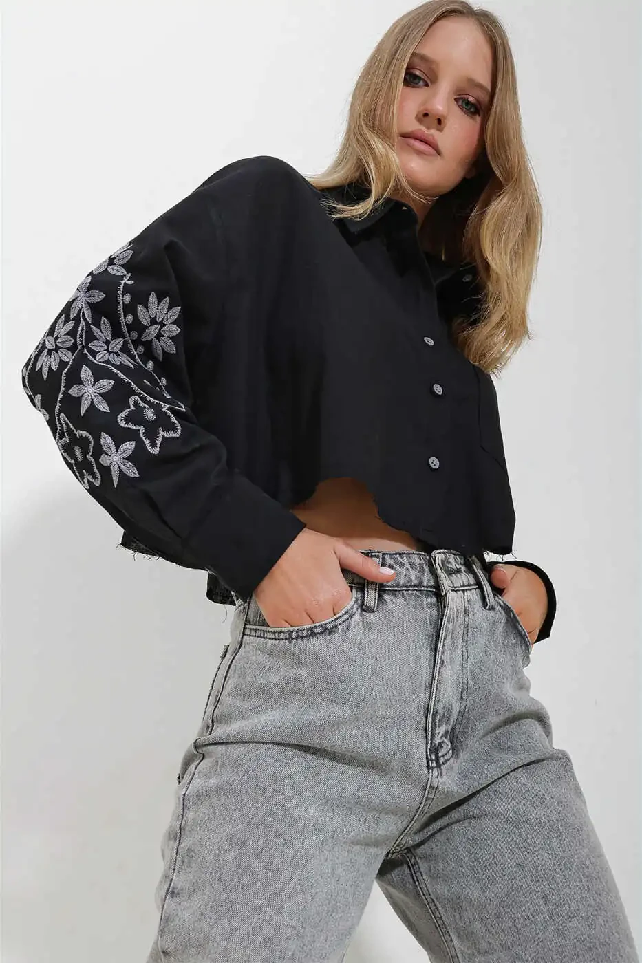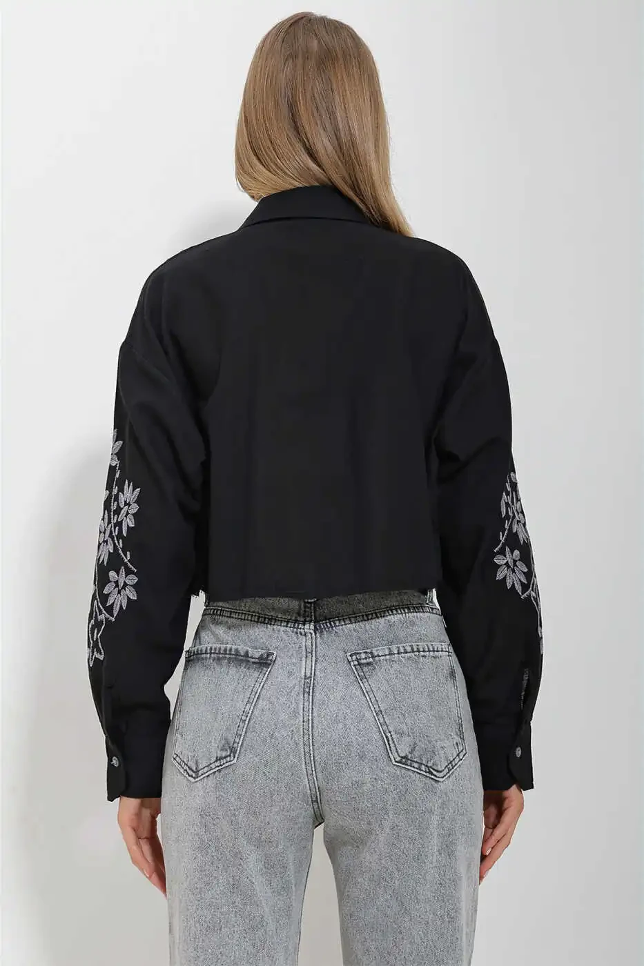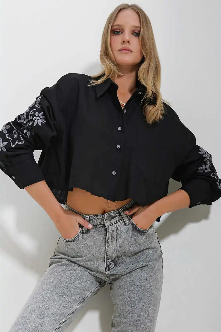 Женская Черная Рубашка Кроп Топ с Вышивкой на Рукавах и одним Карманом ALC-X11631 - отличный выбор, чтобы подчеркнуть ваш стиль. Со своим стильным дизайном и комфортом, она предлагает потрясающий вид в любой обстановке. Эта рубашка кроп топ, которая привлекает внимание своим черным цветом и изящными вышитыми деталями, разработана, чтобы соответствовать любому случаю, от повседневного использования до вечернего выхода.