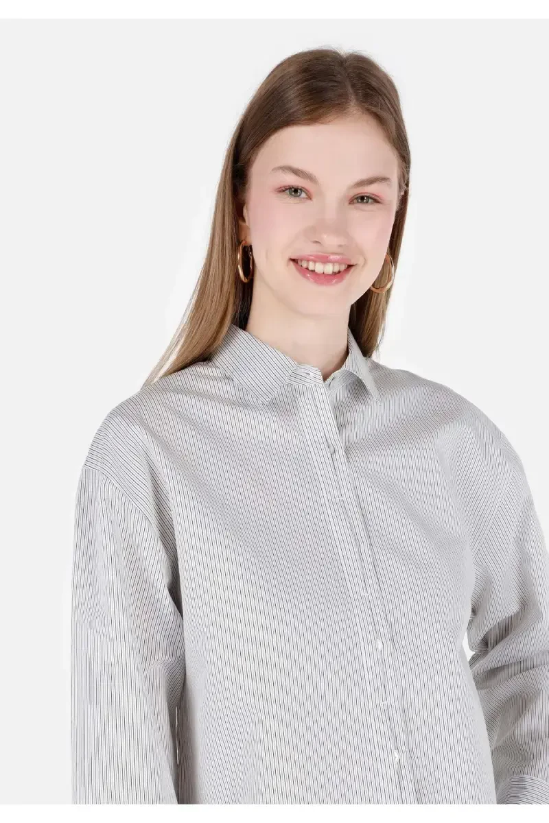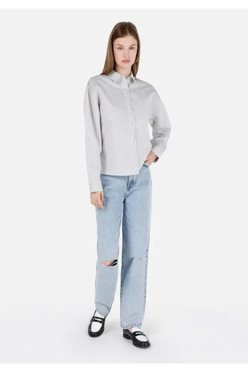 Почувствуйте стиль и комфорт с Рубашкой с воротником в полоску белого цвета для женщин с длинным рукавом!