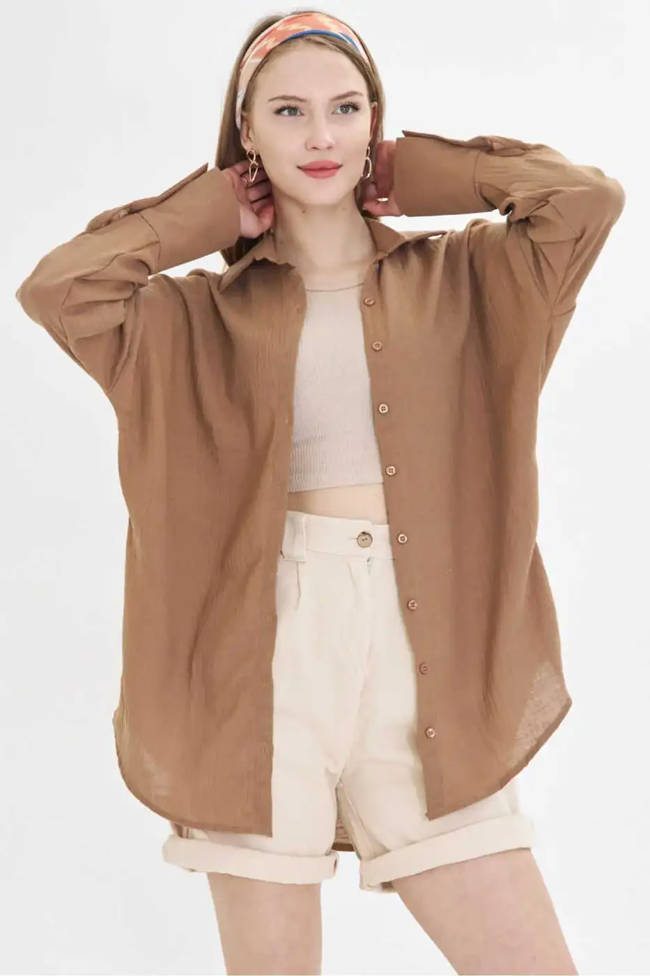 Эта рубашка оверсайз, сочетающая в себе комфорт и стиль, станет вашей незаменимой вещью летом! Светло-коричневый цвет и текстурированная ткань с эффектом льна будут держать вас в прохладе и комфорте в летнюю жару. Широкие рукава добавят изысканности вашему стилю.