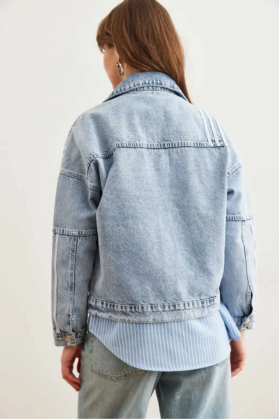 Женская синяя джинсовая куртка с карманами и 3 полосками - CKT-19000421