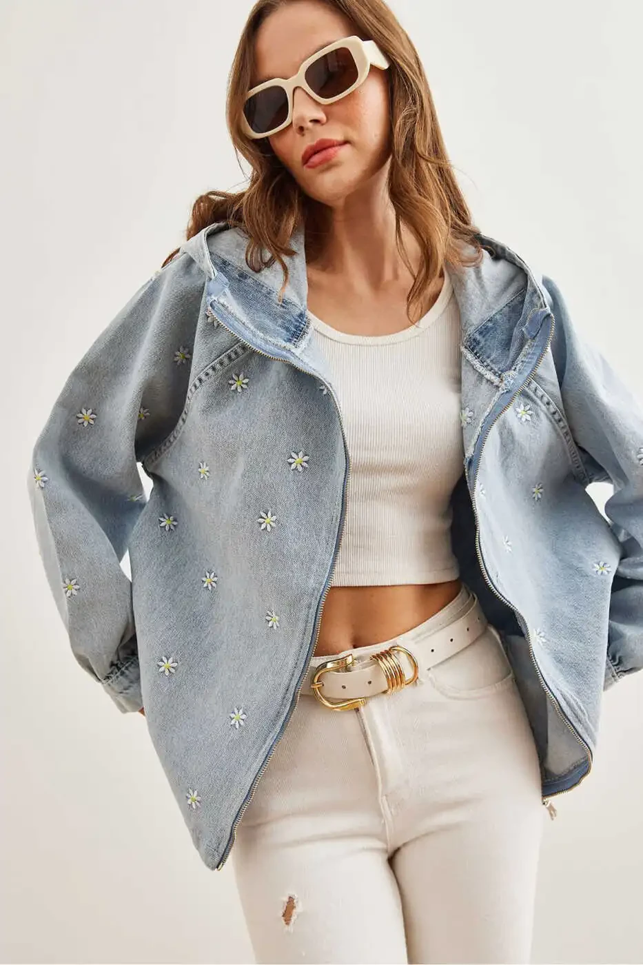 Женская синяя джинсовая куртка с застежкой-молнией, карманами, капюшоном и вышивкой | Olalook