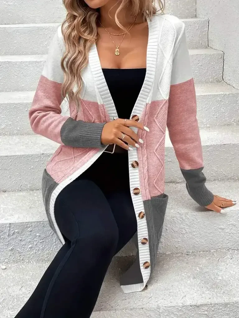 Познакомьтесь с нашей женской трикотажной кофтой с длинными рукавами, передней застежкой на пуговицах и карманами, сочетающей в себе элегантность и комфорт! Эта эксклюзивно разработанная кофта согреет вас в холодные зимние дни, позволяя при этом выглядеть стильно и современно, став незаменимой частью вашего гардероба. Изготовленная из мягкой и качественной трикотажной ткани, наша кофта обеспечивает комфорт на весь день, а дизайн с сочетанием цветов добавит изюминку вашему стилю. Благодаря застежке на пуговицах спереди, ее легко надевать и снимать, комбинируя с чем угодно. В практичных карманах вы можете безопасно хранить мелкие вещи. Идеально подходящая как для повседневного использования, так и для особых случаев, эта кофта — универсальный вариант, который подойдет к любому стилю. Натуральный внутренний материал подарит ощущение шелка на вашей коже, а длинные рукава защитят вас от холода. Модель на фото демонстрирует размер M/38. Параметры модели: рост 165 см, вес 55 кг, грудь 90 см, талия 72 см, бедра 100 см. Эта информация поможет вам с выбором размера. Предлагаемая в разных цветах и размерах, наша кофта позволит вам выбрать наиболее подходящий вариант. Закажите прямо сейчас и проведите зимние месяцы в тепле и элегантности!