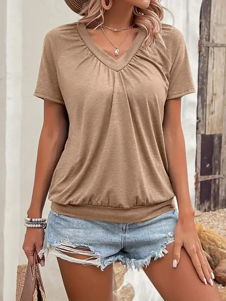 вискозная блузка, блузка с короткими рукавами, блузка с V-образным вырезом, блузка с деталями сборки, женская блузка, летняя блузка, шикарная блузка, удобная блузка, вискозная ткань, женская одежда