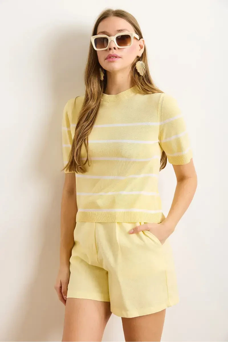 Наше изделие изготовлено из высококачественного вискозного трикотажа. Мягкая текстура ткани нежно соприкасается с вашей кожей, а свободный крой обеспечивает комфорт в течение всего дня. Полосатый узор и желто-белая цветовая комбинация легко сочетаются с любым стилем. Эта блузка, которую вы можете использовать как в спортивных, так и в классических комбинациях, станет одной из самых универсальных вещей в вашем гардеробе. Размер модели на фото S/36. Чтобы наше изделие дольше оставалось как новым, пожалуйста, соблюдайте инструкции по стирке и глажке. Чтобы цвета дольше оставались яркими, стирайте наизнанку и не сушите под прямыми солнечными лучами.