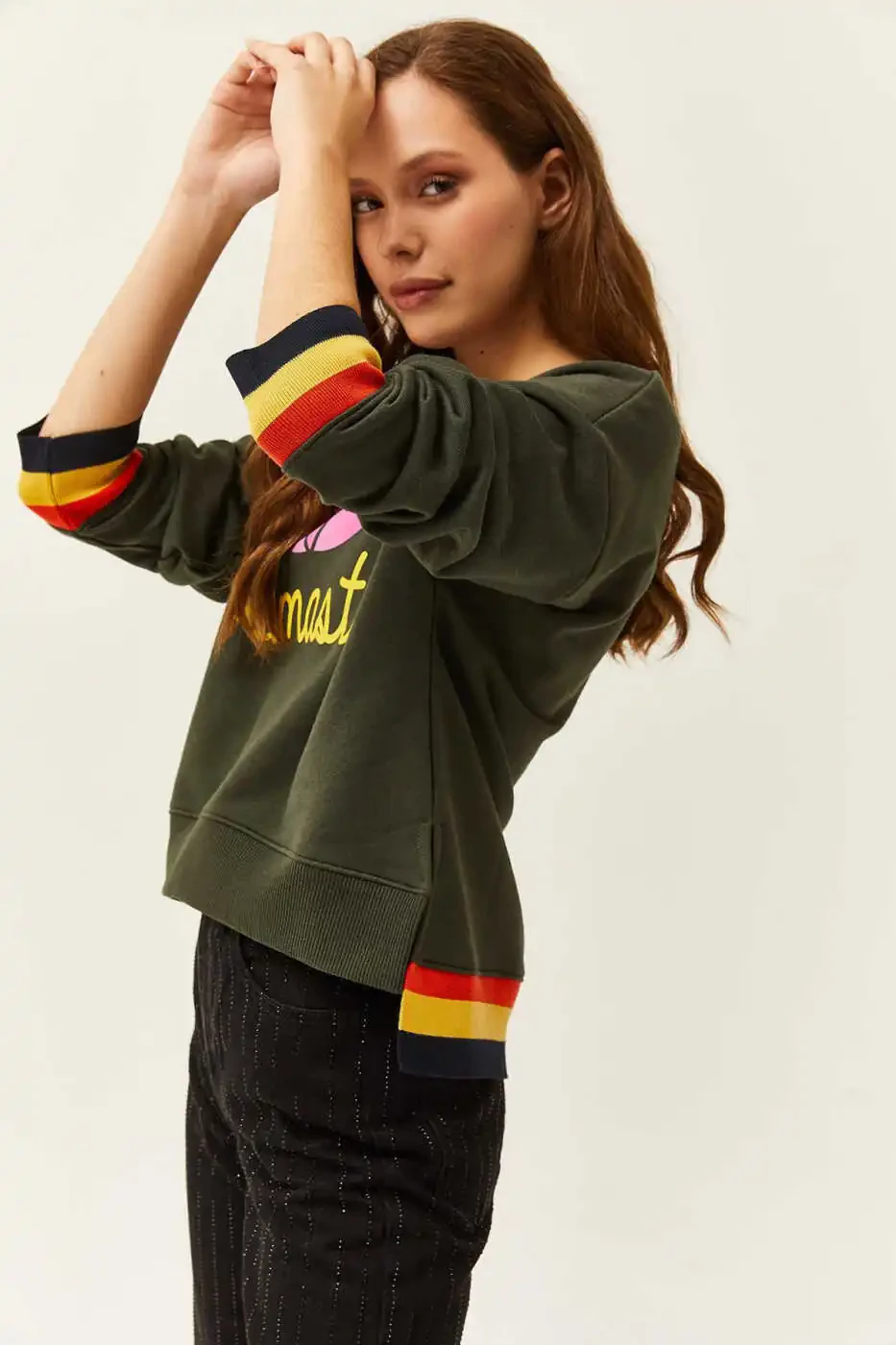 **Женская толстовка цвета хаки с принтом Nameste, премиум-класса, с ленточными деталями, SWT-19000640**