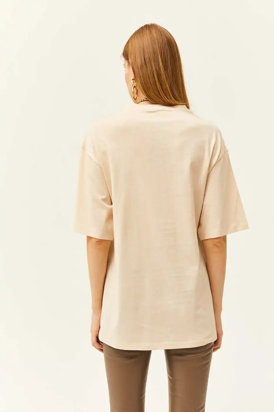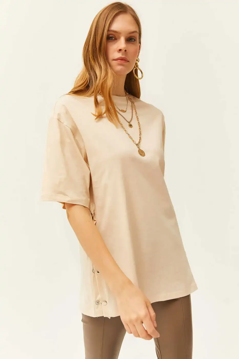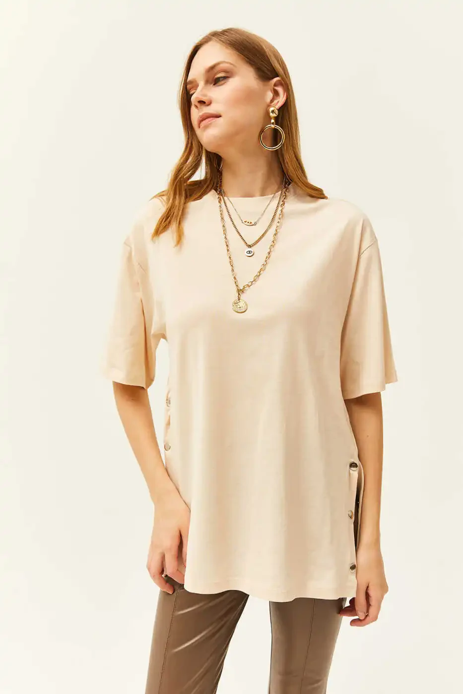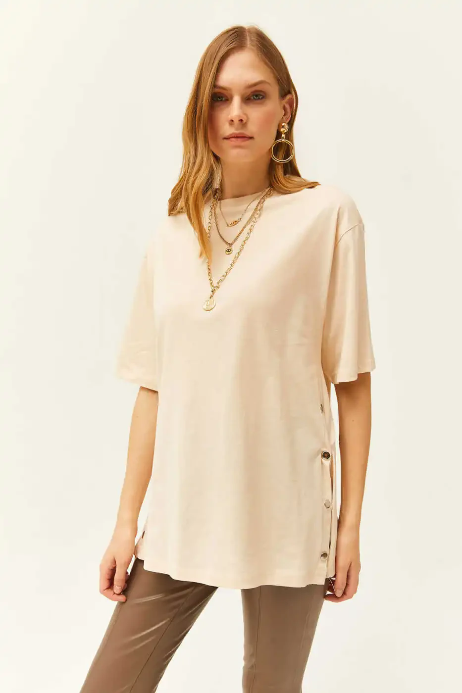 Женская хлопковая футболка бежевого цвета с пуговицами по бокам TSH-19000762 - Комфортная и стильная