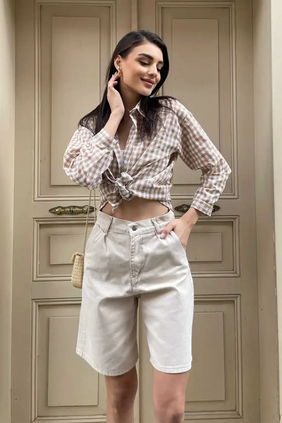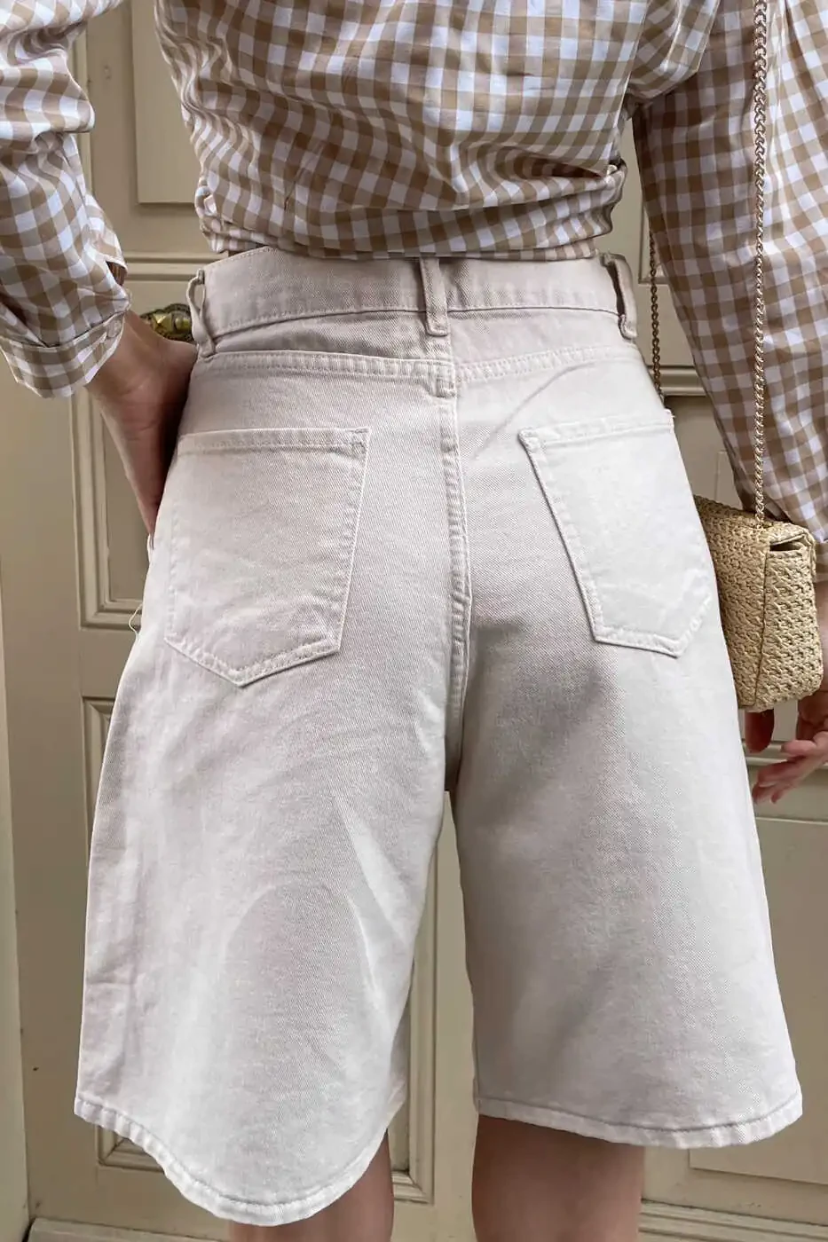 Женские бежевые шорты-бермуды из денима с высокой талией и широкими штанинами ALC-X8174 - идеальный выбор для женщин, ценящих стиль и комфорт. Закажите сейчас и добавьте изюминку в свой гардероб!